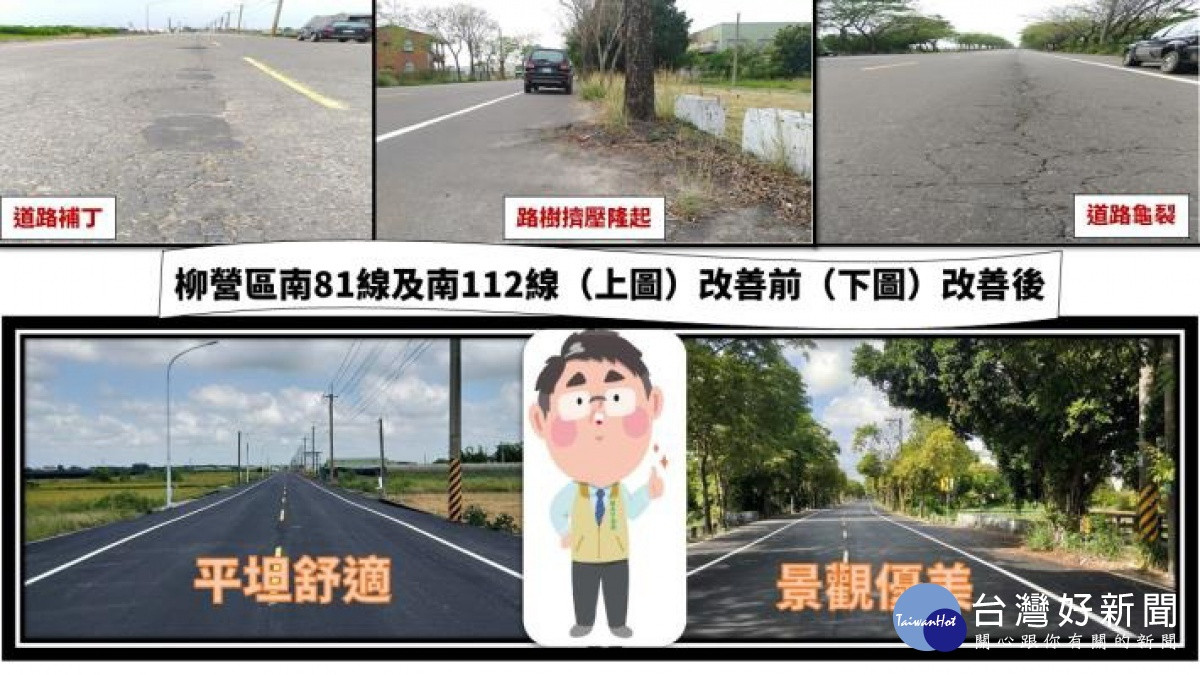 工務局表示,柳營區南81線本次改善路段為小腳腿往果毅後銜接柳營科工區之連絡道路,並連結義士路綠色隧道,是地方往來通勤與產業之主要道路,而南112線改善路段為果毅後通往荷蘭村之聯絡要道,因荷蘭村觀光興盛及地方產業需求,往來車流量大且頻繁,致使路面在長年輾壓及材料使用期限生命週期,已經嚴重龜裂、車轍及凹陷等現象。