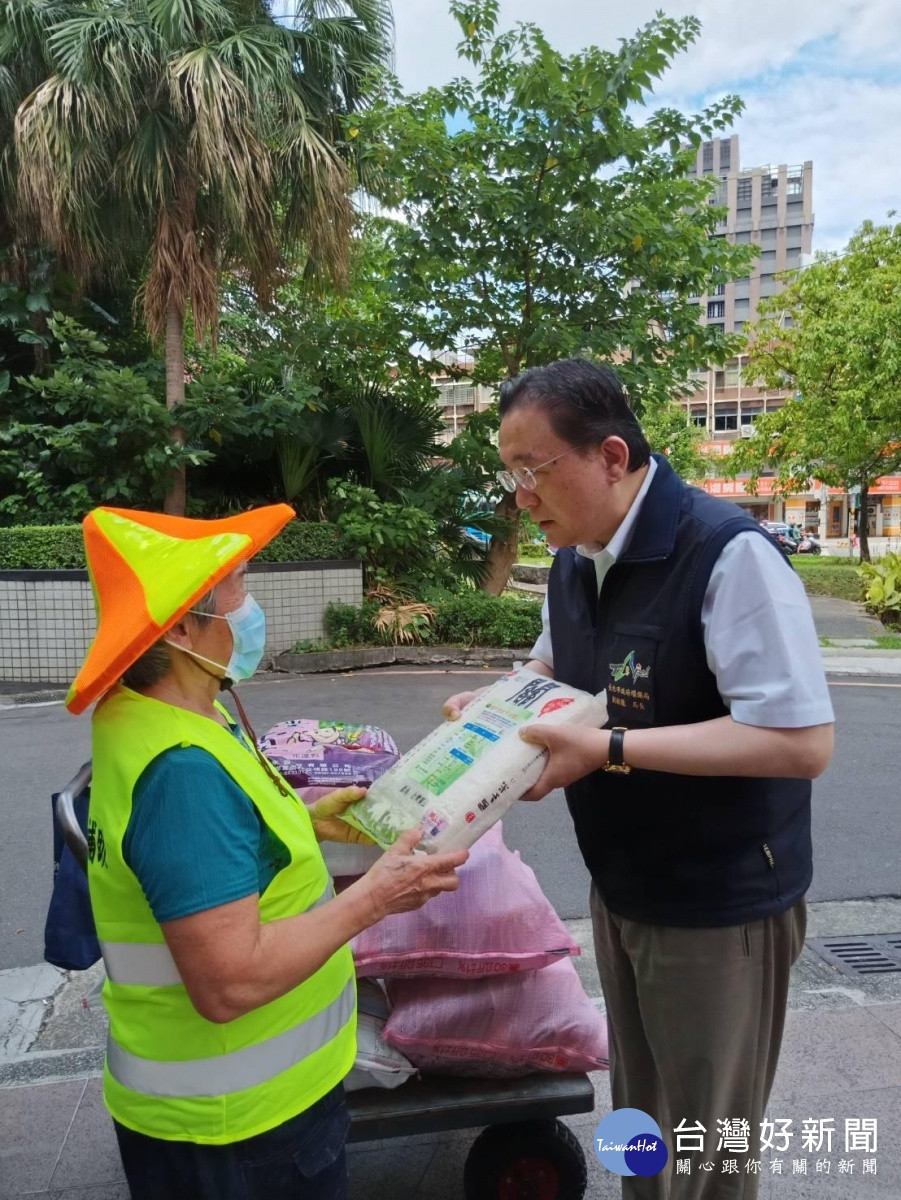 除加碼補助外,環保局同時發送國產優質米予轄區列冊的資收個體戶,讓基層資收戶能切身感受到政府的用心與關懷。同時,在端午節前夕,環保局長劉銘龍代表北市府,特地前往資收個體戶張女士的工作地點慰問關懷,致贈國產優質米、端午賀禮與反光背心,提前祝賀佳節。