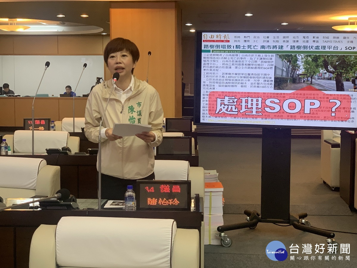 市議員陳怡珍質詢指出,台南市自5月19日發生北區延平國中圍牆外路樹倒塌,造成女騎士死亡及一位小客車駕駛受傷的意外後,接續又有南區中華南路二段300巷附近公園菩提樹應聲倒地,壓毀停在路旁停車格內的2台轎車;中西區全台開基永華宮廟埕前百年榕樹傾倒;甚至,台南女中體育館前一棵近50年南洋杉也突然在6月1日倒下。顯見台南市所有樹木急需進行總體檢,全市共有約15萬棵路樹,先前市長黃偉哲下令召開「路樹倒伏處理平台」,召開跨局處的統合性會議,建立全市路樹處理的SOP標準作業流程。另外,農業局也制定樹木風險評估表,通令各權責單位依據該評估表,自主進行高風險樹木體檢,讓第一線人員以肉眼檢查樹木。但是,市府跨局處統合性會議,在事發至今逾一個月後才制定出樹木風險評估表,並在上週行文各單位開始執行樹木體檢,市府動作實在太緩慢。