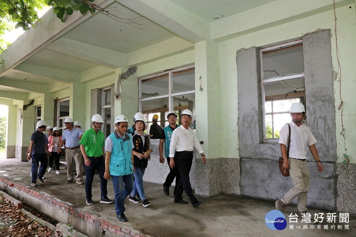 翁章梁6月25日由義竹鄉長黃阿家、縣議員蔡瑋傑、鄉代會主席翁榮輝、縣府建設局長林聰利和嘉義縣社會局長肅英成等人陪同,實地了解改建進度及空間規劃情形,並聽取施工單位工程簡報。