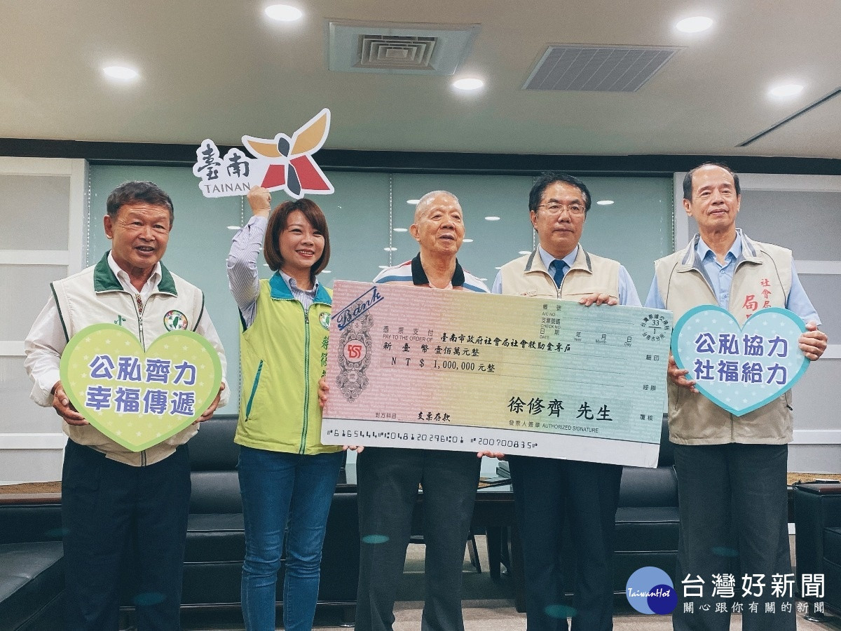 臺南市政府市政顧問徐修齊長年熱心公益,特別捐贈新臺幣100萬元善款給臺南市政府,用實際行動支持市府社會局協助弱勢家戶。黃偉哲市長15日上午親自頒贈感謝狀,並邀請更多善心人士共襄盛舉,一同體現「照顧弱勢優先」的城市願景。
