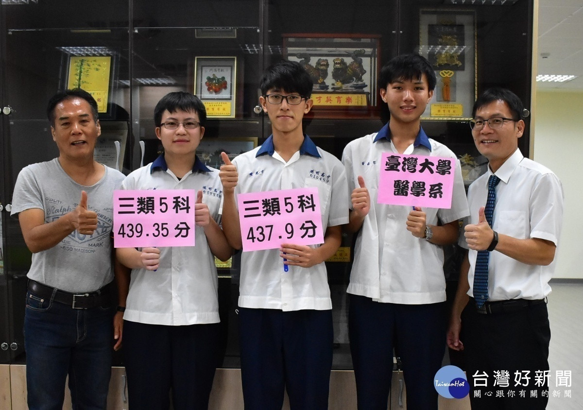 港明高中指考成績亮眼,(右一起)為劉春福校長、黃鈺哲同學、陳建宇同學、蔡永霖同學、陳武民老師。