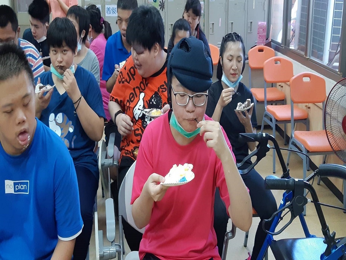 喜樂日間作業所旗舞社8位服務對象,運用扇子搭配鏗鏘有力的歌曲「將軍令」來迎賓,表演的氣勢與努力精神獲得滿堂采。壽星翔宇、之浩、美吟、美玉、、珮辰歡喜站在舞台前讓大家唱生日快樂歌祝福他們,從貴賓手中接到生日禮物並一起切生日蛋糕,幸福洋溢在臉上。麥仕佳經理及店長協助切生日蛋糕送給每一位服務對象,儼然是幸福的製造者,讓喜樂孩子有機會享用豐盛甜蜜的幸福感。
