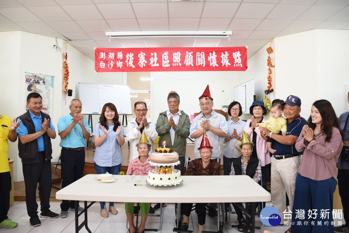澎湖縣長賴峰偉13日出席後寮社區關懷據點重陽慶生同樂會,為高齡101歲的人瑞顏葉桂華及94歲四代同堂許葉春妃切蛋糕慶生,並祝福所有壽星健康長壽、平安快樂。