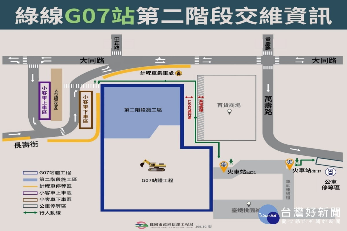 桃園捷運綠線G07(桃園)站的站體施工範圍包括「臺鐵舊站」及「部分前站圓環」,109年5月4日於「臺鐵舊站」內進行第一階段連續壁工程後,109年11月3日將接續進行第二階段施工作業,包括車站連續壁、開挖及結構體施作;因G07(桃園站)採明挖施工,開挖面積大且深度達40公尺,工區範圍將從目前圍籬位置往大同路方向延伸,再往外推44公尺(未包括大同路部分),大同路上雙向車道不受影響。