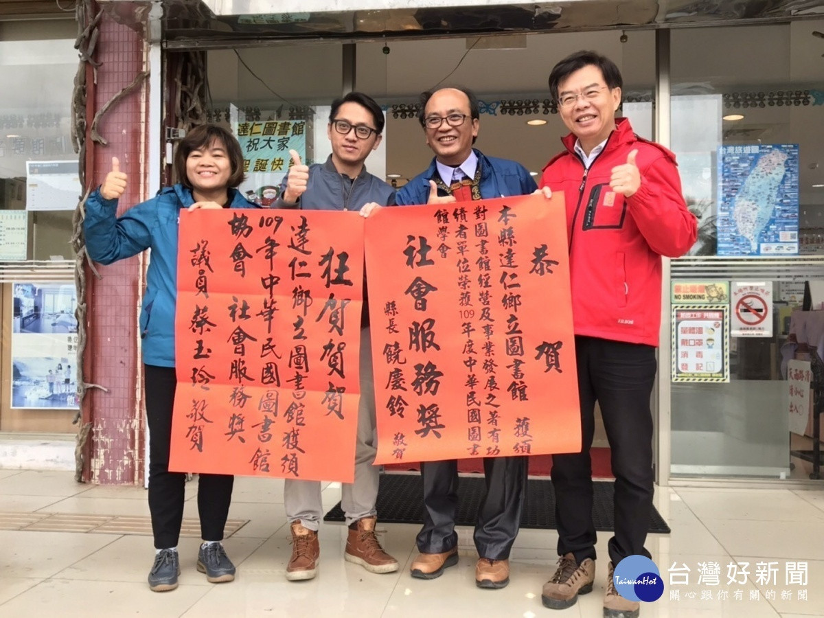 台東縣府推薦達仁鄉立圖書館,參與中華民國圖書館學會對圖書館事業具有貢獻者評獎,該鄉以「你不方便來,我去為你服務,開啟閱讀零距離」的服務理念作法,具體事蹟作法深受委員肯定榮獲「社會服務獎」殊榮,12日縣府文化處鍾青柏處長特別代表饒慶鈴縣長致贈紅榜,向來關注地方建設的蔡玉玲縣議員亦到場祝賀,讚許陳新輝鄉長及吳政德館長推動服務創新的努力以及帶給鄉民優質的閱讀服務。