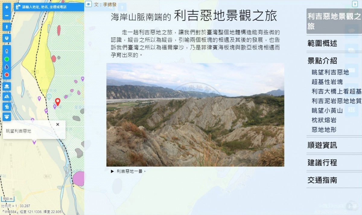 民眾可透過地調所官網,於「地質資訊服務」項下的地質雲加值應用平台,進入「創意地質旅遊」主題應用(https://reurl.cc/4y6v7D),平平中除整合多樣地質圖資外,亦包含活動斷層、地層、土壤液化、工程鑽井等,以簡單的操作方式與視覺化主題服務,提供實用的地質資訊,歡迎民眾上網體驗。