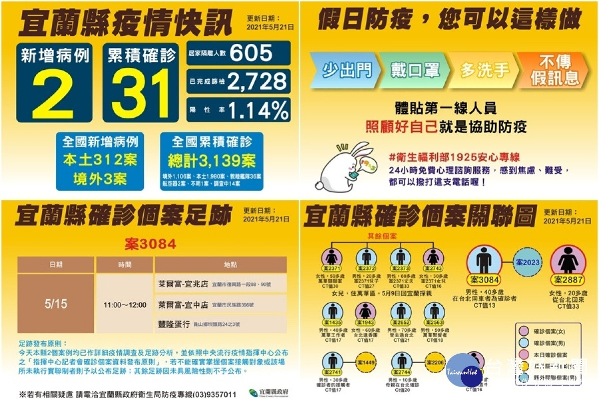 另外,案3084為40多歲男性,5月14日赴台北,與朋友一起前往南投參加公祭後回到宜蘭,全程都是自行開車。之後與他同行的友人確診,他於5月18日至醫院採檢,今天確診。