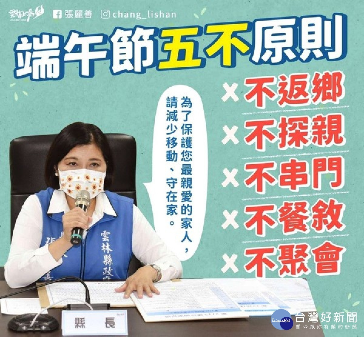 張麗善呼籲鄉親忍一時不便,遵守端午節「五不原則」不返鄉、不探親、不串門、不餐敘、不聚會,避免移動也避免家庭群聚,共度疫情難關。