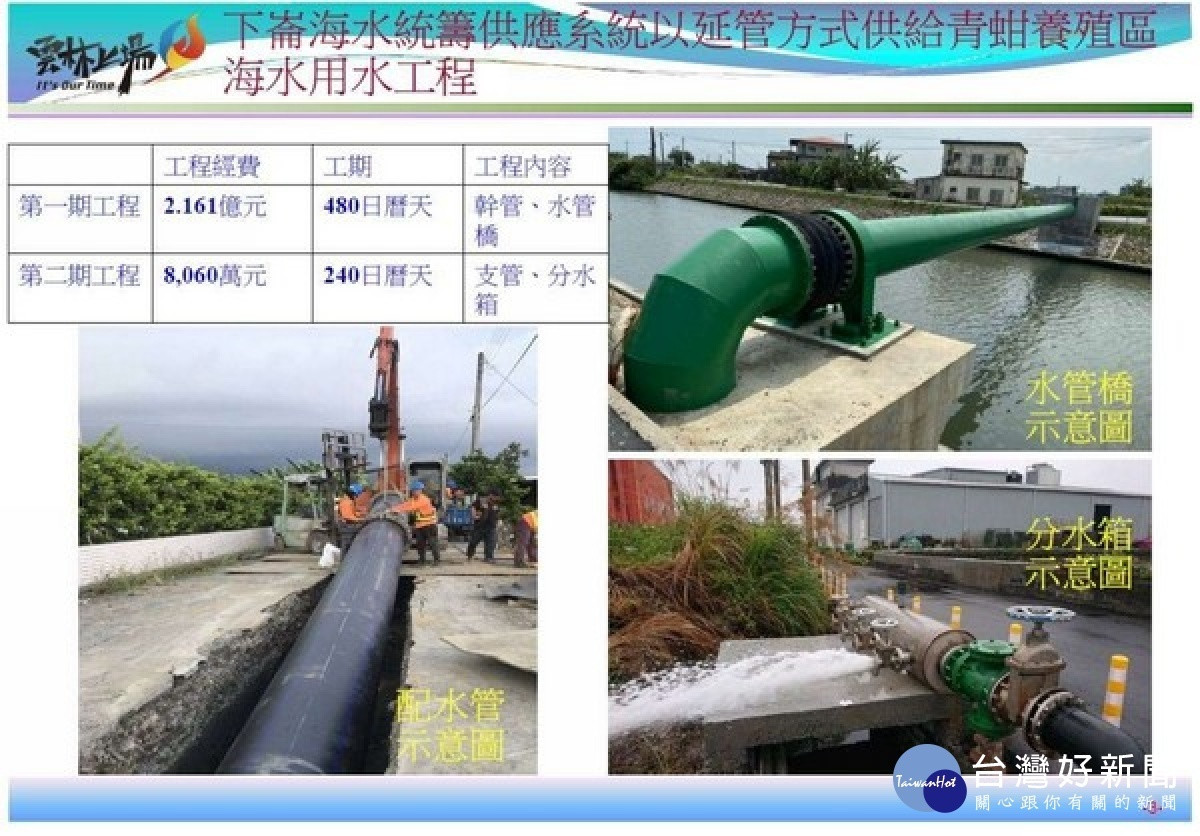 雲縣府規劃興設養殖專用海水引水設施,辦理下崙海水統籌供應系統以延管方式供給青蚶養殖區海水用水工程。
