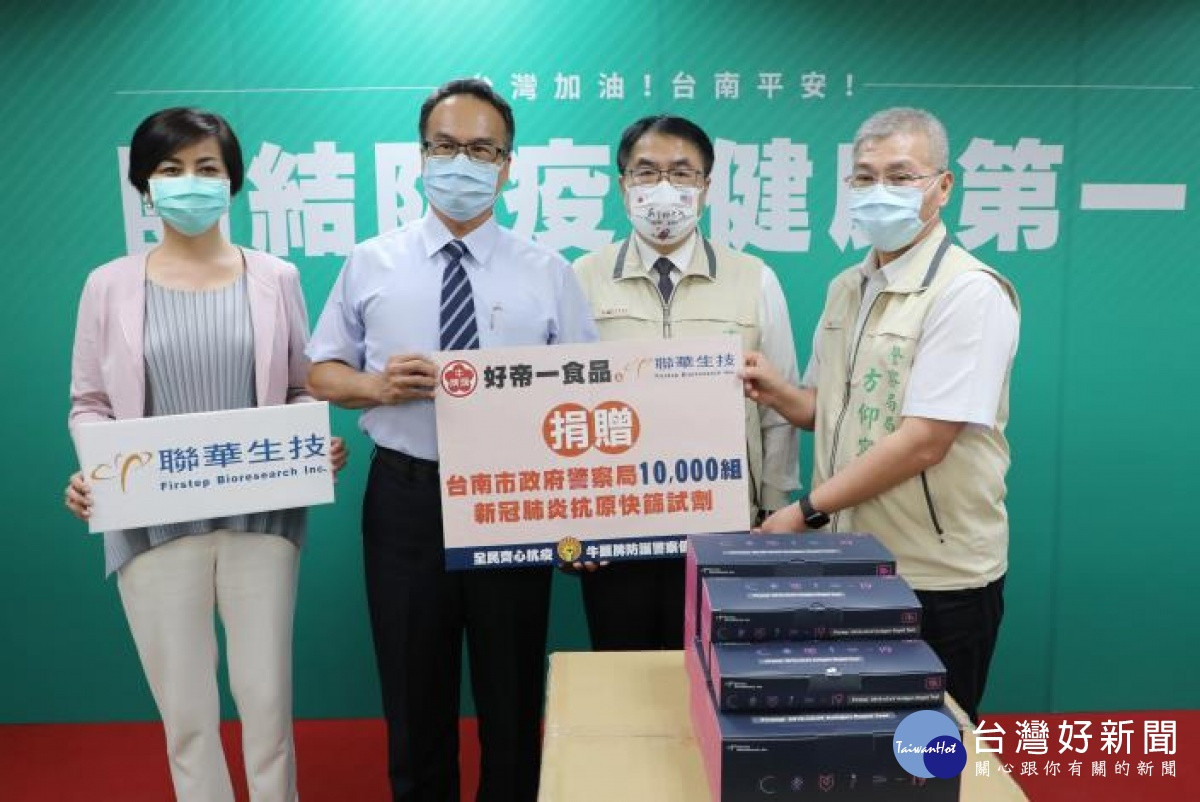 台南在地企業「好帝一食品有限公司」關心台南市基層員警協助防疫辛勞,與聯華生技股份有限公司共同捐贈1萬組快篩試劑,專案提供台南市警察局使用。好帝一食品副總經理林志穎、聯華生技董事長沈碧蘭28日出席捐贈儀式,由台南市長黃偉哲代表受贈,並回贈警察寶寶以表達警察同仁的謝意。