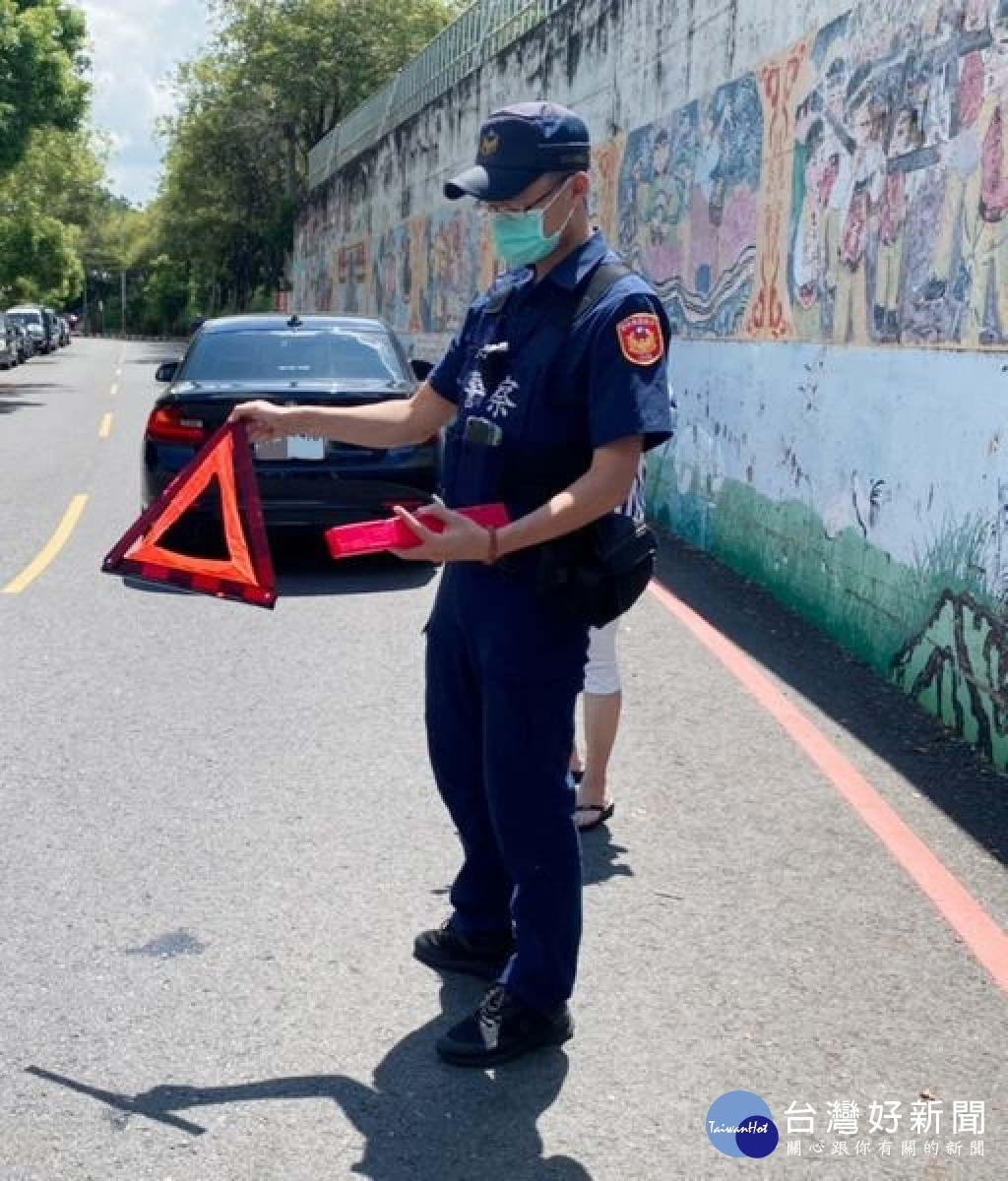 北港分局北港派出所警員吳宗翰、詹佳怡日前近午巡邏行經北港鎮水道頭公園前,發現一部自小客車打著雙黃警示燈,停於道路正中央,造成防汛道路上車輛回堵。