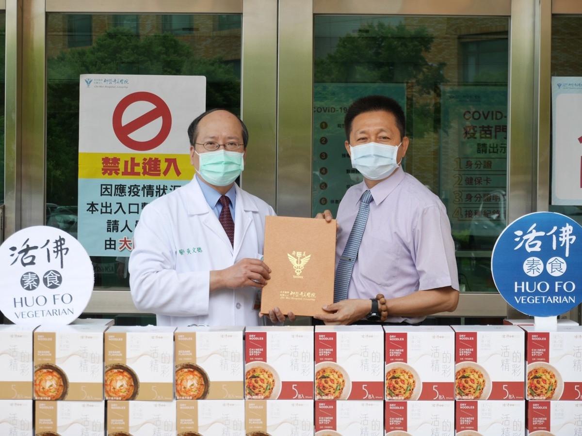 感恩第一線的醫護人員仍堅守崗位堅毅付出,活佛素食8/4上午捐贈600盒活的精彩系列乾拌麵給柳營奇美醫院,由黃文聰副院代接受。