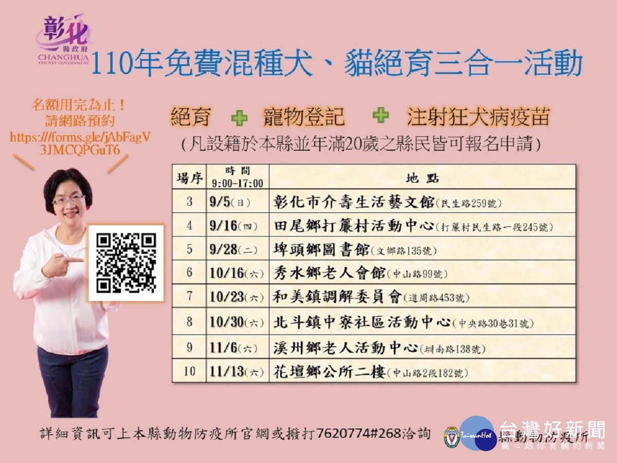 110年免費混種犬貓絕育三合一活動剩餘8場次:9/5(日)在彰化市介壽生活藝文館、9/16(四)在田尾鄉打簾村活動中心、9/28(二)在埤頭鄉立圖書館、10/16(六)在秀水老人會館、10/23(六)在和美鎮調解委員會、10/30(六)在北斗鎮中寮社區活動中心、11/6(六)在溪州老人活動中心及11/16(六)在花壇鄉公所二樓,歡迎符合資格之民眾線上報名參加。