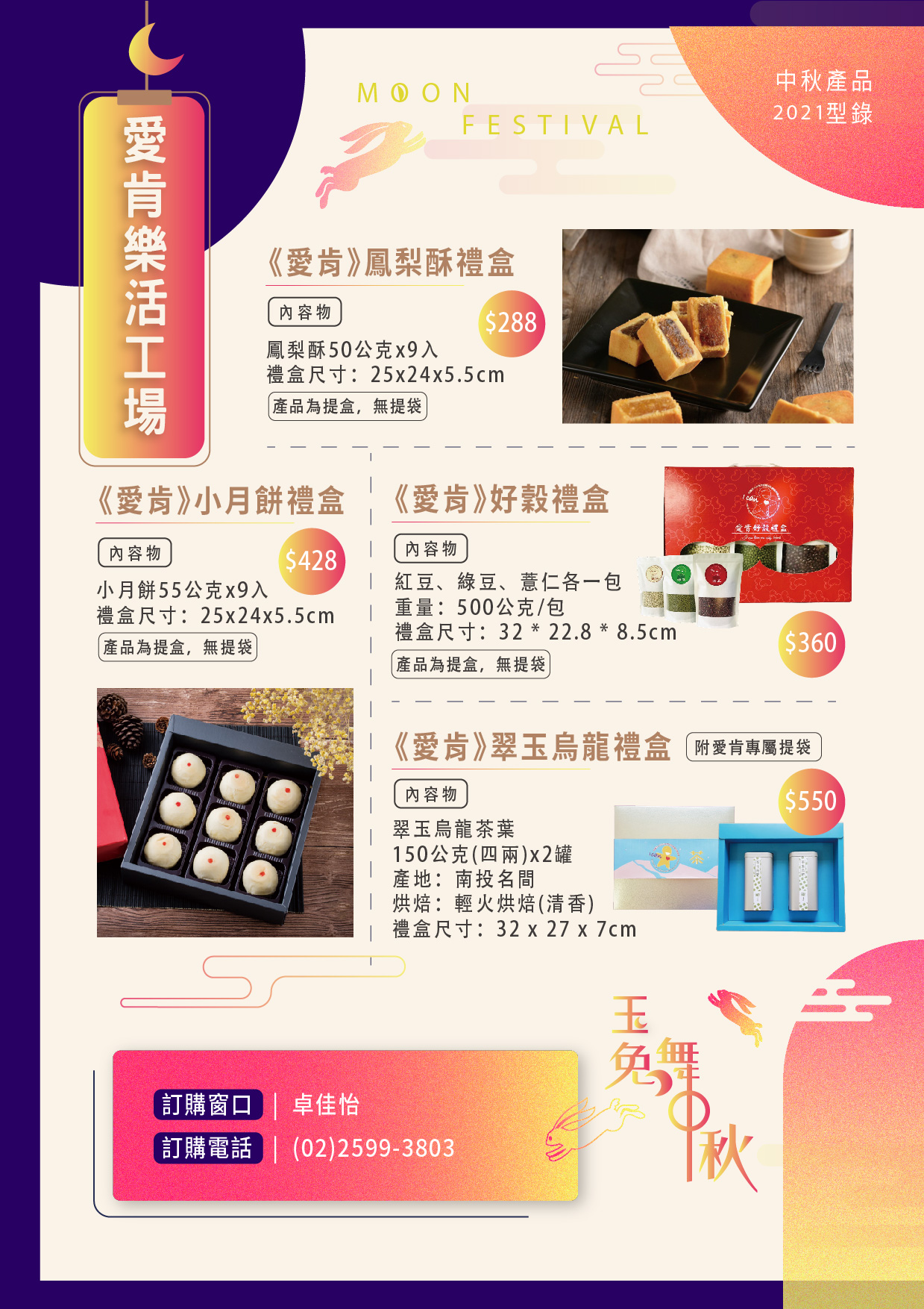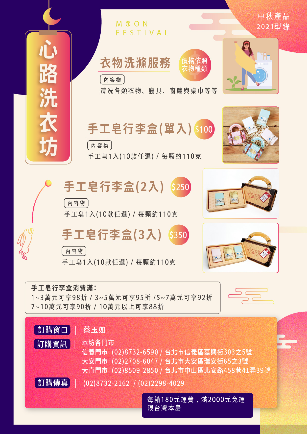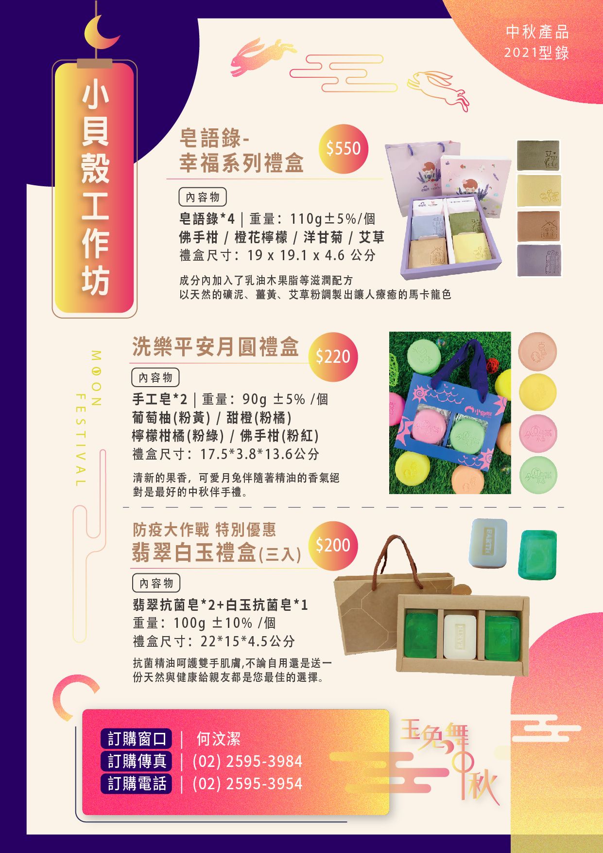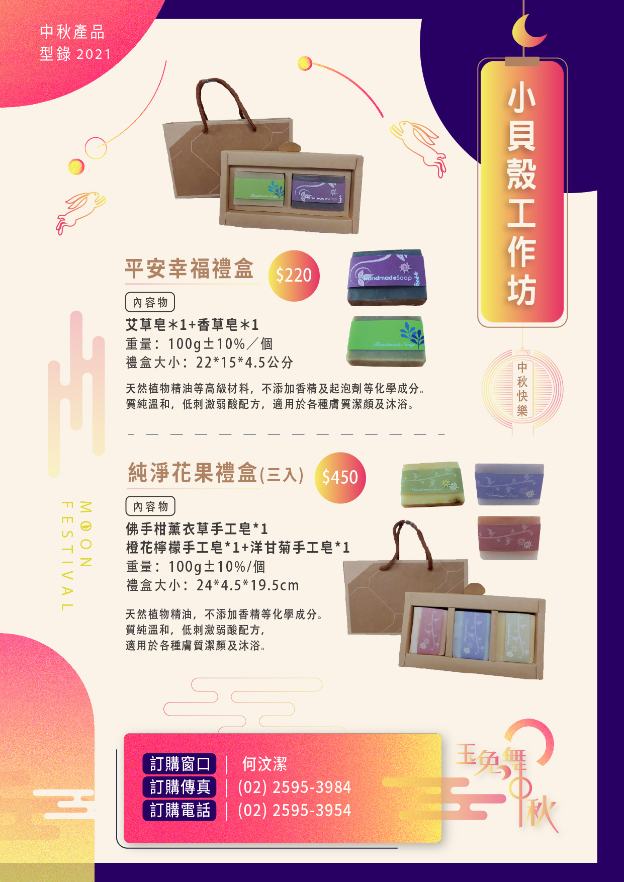今年中秋節,庇護工場「中秋好禮獎不完」消費送好禮的抽獎活動,再加碼推出「中秋好禮買1送1」加倍送好禮,有特色月餅禮盒、精選耳掛咖啡包、多樣手工餅乾、手工皂等優質禮盒,也有服務類庇護工場,像是居家清潔服務、洗衣服務、洗車打蠟等等,更有印刷類服務、玻璃琉璃飾品類、手工皂、3C產品類等多元豐富的商品,希望能夠藉由抽黃金以及買一送一活動促進民眾消費的意願。