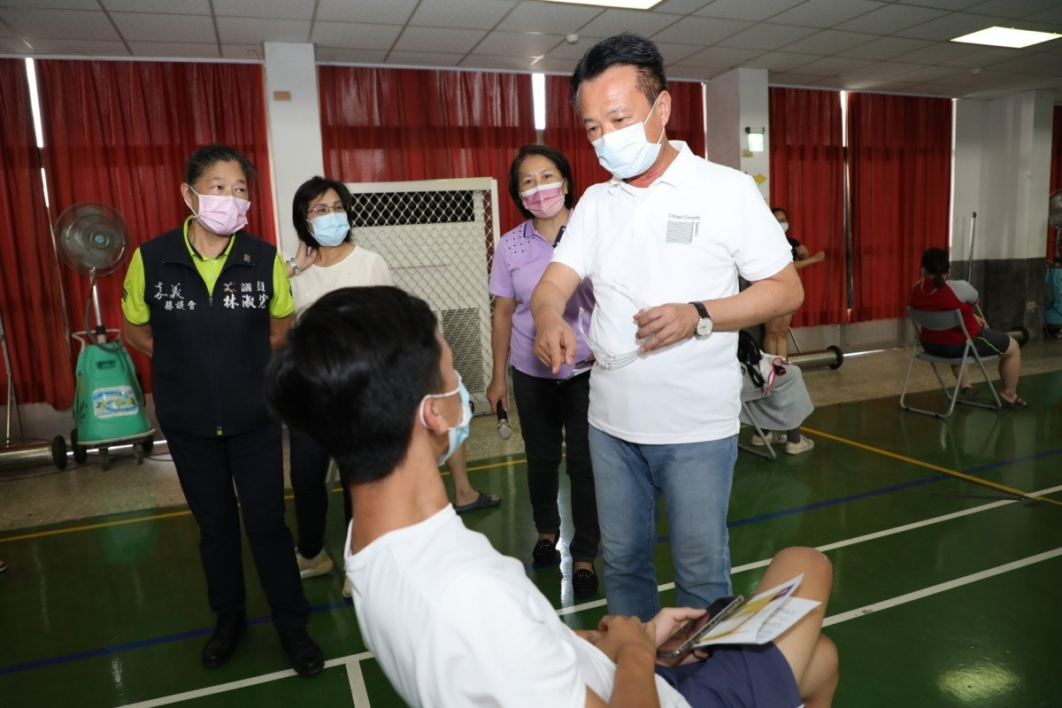 民雄國中大型接種站原訂12日開打,因颱風延期至26日,翁章梁下午由縣議員林淑完和衛生局長趙紋華陪同,前往民雄國中關心施打情形,趙紋華現場簡報報到、等候通知區、接種動線的安排、觀察區、不良事件處置,以及醫療團隊和志工的服務情形,26日預計為2500位民眾施打第一、二劑AZ疫苗。