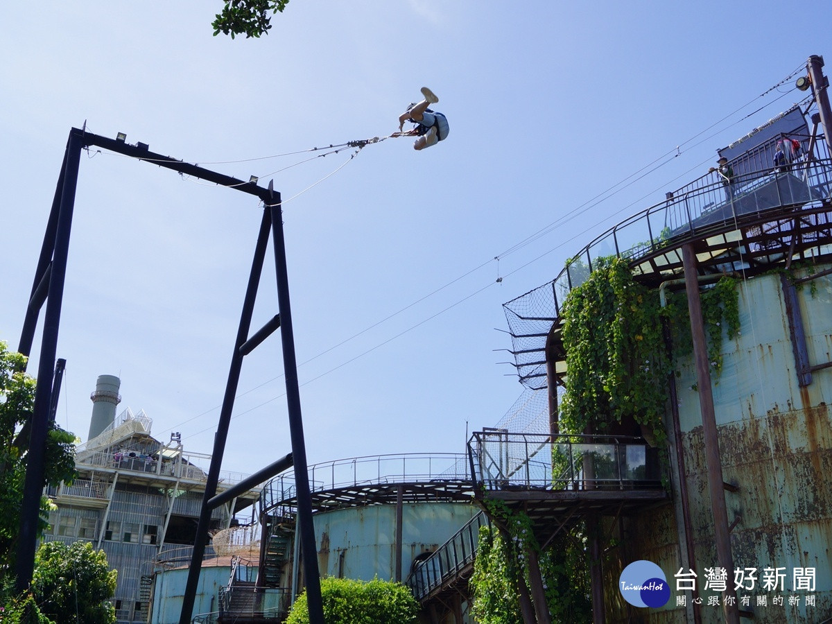 國慶連假即將來臨,疫情漸趨緩生活慢慢回復正常,十鼓文創2021年再創極限新挑戰,全臺首創160度極限大擺盪15米高(約5層樓)設施,引進國際安全證認極限運動設備,讓體驗者從15米高空急速墜落,利用物理拋物線原理3分鐘來回擺盪,體驗者就好像搭乘沒有船的海盜船感受更加驚奇刺激。