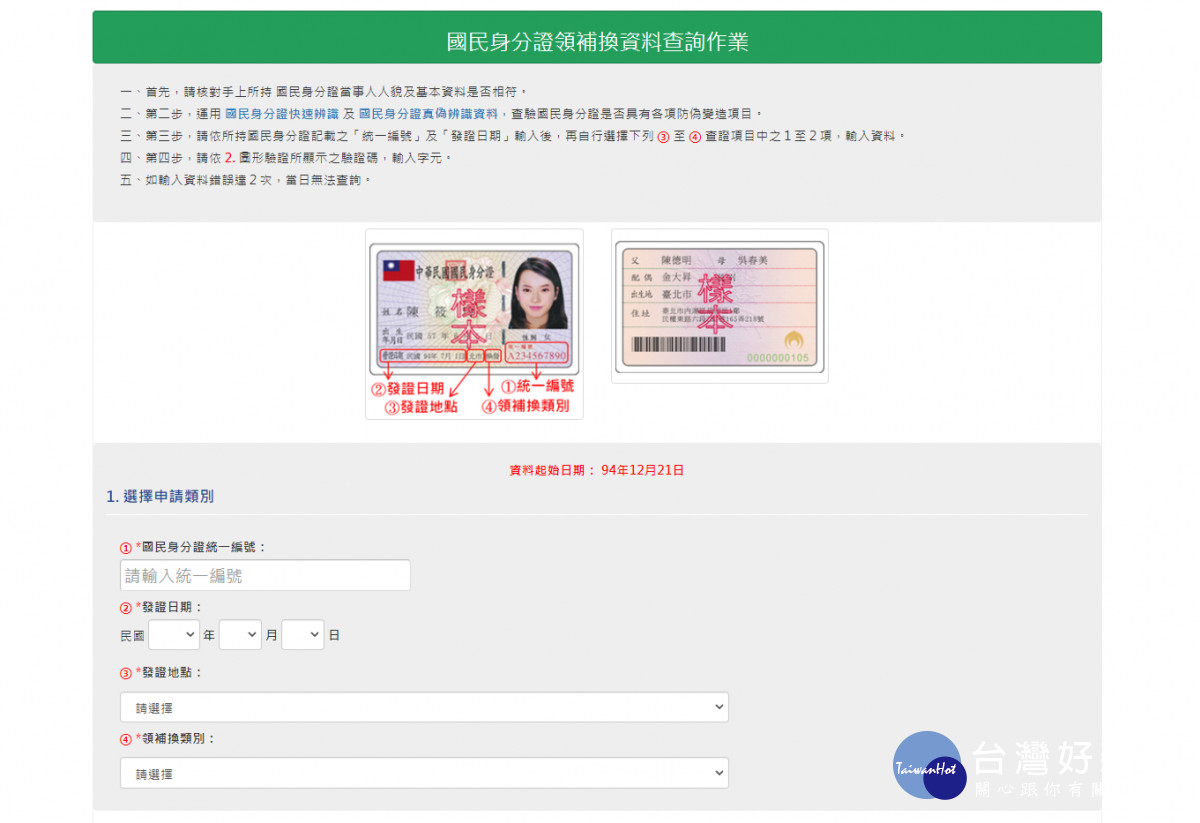 此外,內政部戶政司全球資訊網「國民身分證領補換資料查詢作業」專區( https://www.ris.gov.tw/app/portal/3014 ),也提供各機關或人民快速驗證國民身分證真偽,協助核對手上持有國民身分證的基本資料是否相符,歡迎民眾多加利用。