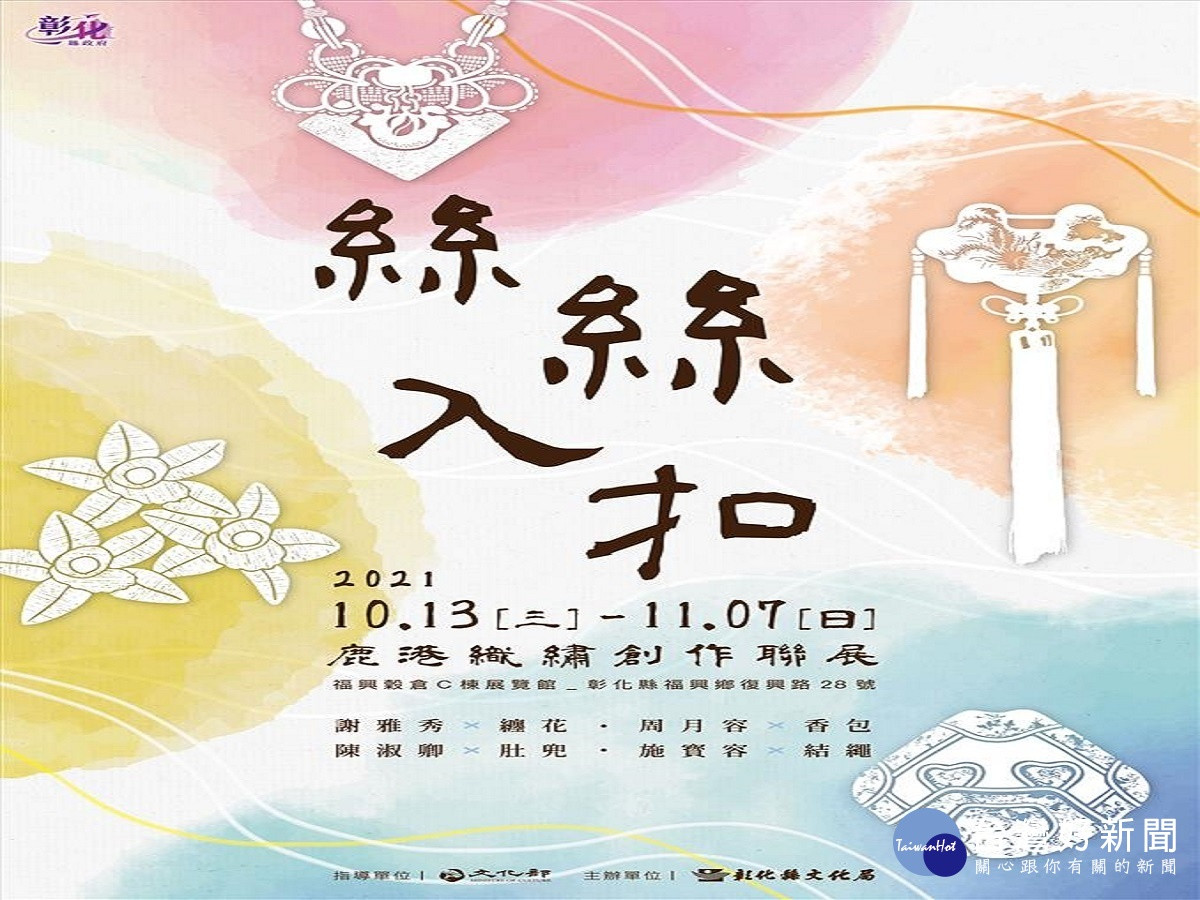 結合現代繩結藝術與新媒材,彰化縣府文化局自10月13日至11月7日於福興穀倉C展覽館辦理「絲絲入扣 鹿港織繡創作聯展」,作品展現鹿港這個風華迷人的文化古城,織繡創作可說是藝術生活化的代表,展示日常生活中的織繡工藝,由彰化縣傳統工藝保存者─中國結保存者施寳容藝師、纏花保存者謝雅秀藝師,以及長年致力於刺繡工藝的周月容藝師及陳淑卿藝師,共同展現工藝創作融合傳統與現代的創新歷程。