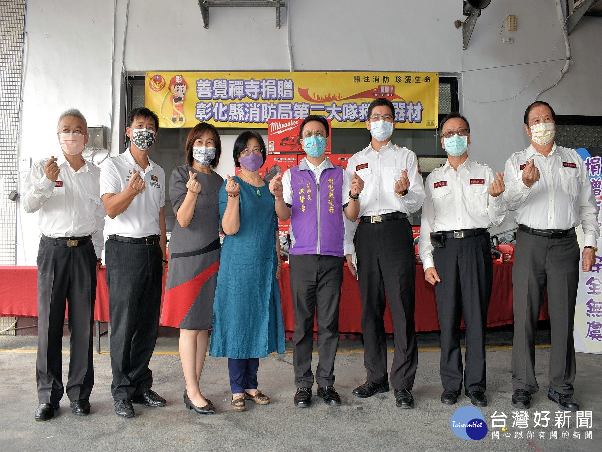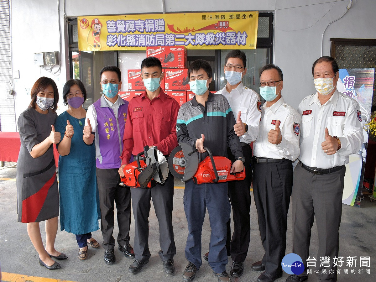 為減輕消防弟兄們搶救上的負擔,提升救援的效率,善覺禪寺體恤消防弟兄的辛勞、於2日捐贈20組電動圓盤切割器(價值新臺幣60萬元)予彰化縣消防局,彰化縣副縣長洪榮章親自出席捐贈典禮,感謝捐贈方對社會公益的付出,並回贈感謝狀合影留念,場面溫馨隆重。