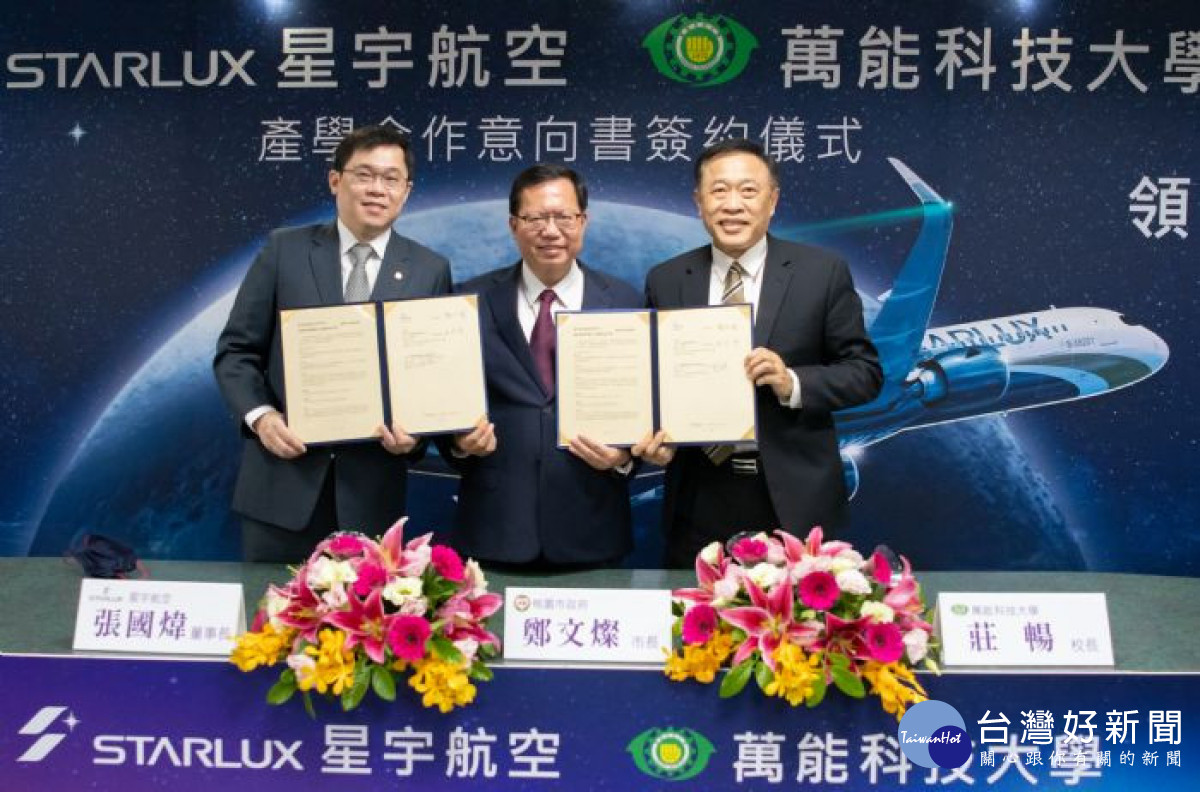 桃園市長鄭文燦8日下午於市府,出席「星宇航空股份有限公司與萬能科技大學產學合作意向書簽約儀式」。鄭市長表示,航空業的範圍很廣,除了空服、地勤,還包括飛機修護、零組件製造、航空物流、航空交通服務、旅遊服務、餐飲服務等,衍生出許多支援產業,是龐大的機場經濟學。今日很高興見證星宇航空及萬能科大建立產學合作,星宇航空是重視飛航安全與優質服務的精品航空,萬能科技大學以航空城大學為定位,雙方強強加相,相信能為台灣航空業添加新的生力軍。
