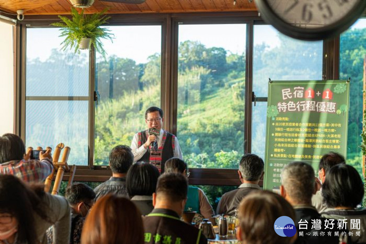 桃園市長鄭文燦11日前往復興區山水奇異民宿,出席「民宿1+1特色行程優惠」宣傳活動。鄭市長表示,桃園目前正在推動劃設北橫國家風景區,以推廣台七線公路沿途的山林之美、部落美食文化和溫泉溯溪活動,而民宿是其中的關鍵角色,在北橫住一晚,不必趕著下山,能深刻感受復興區晨昏獨有的寧靜;桃園即日起推出「民宿1+1特色行程優惠」,結合20家民宿業者提供「住1晚送行程」或「住1晚送1晚」共11個優惠方案,限量名額加碼到1千個,邀請大家來桃園慢活旅遊、體驗民宿、認識北橫之美。