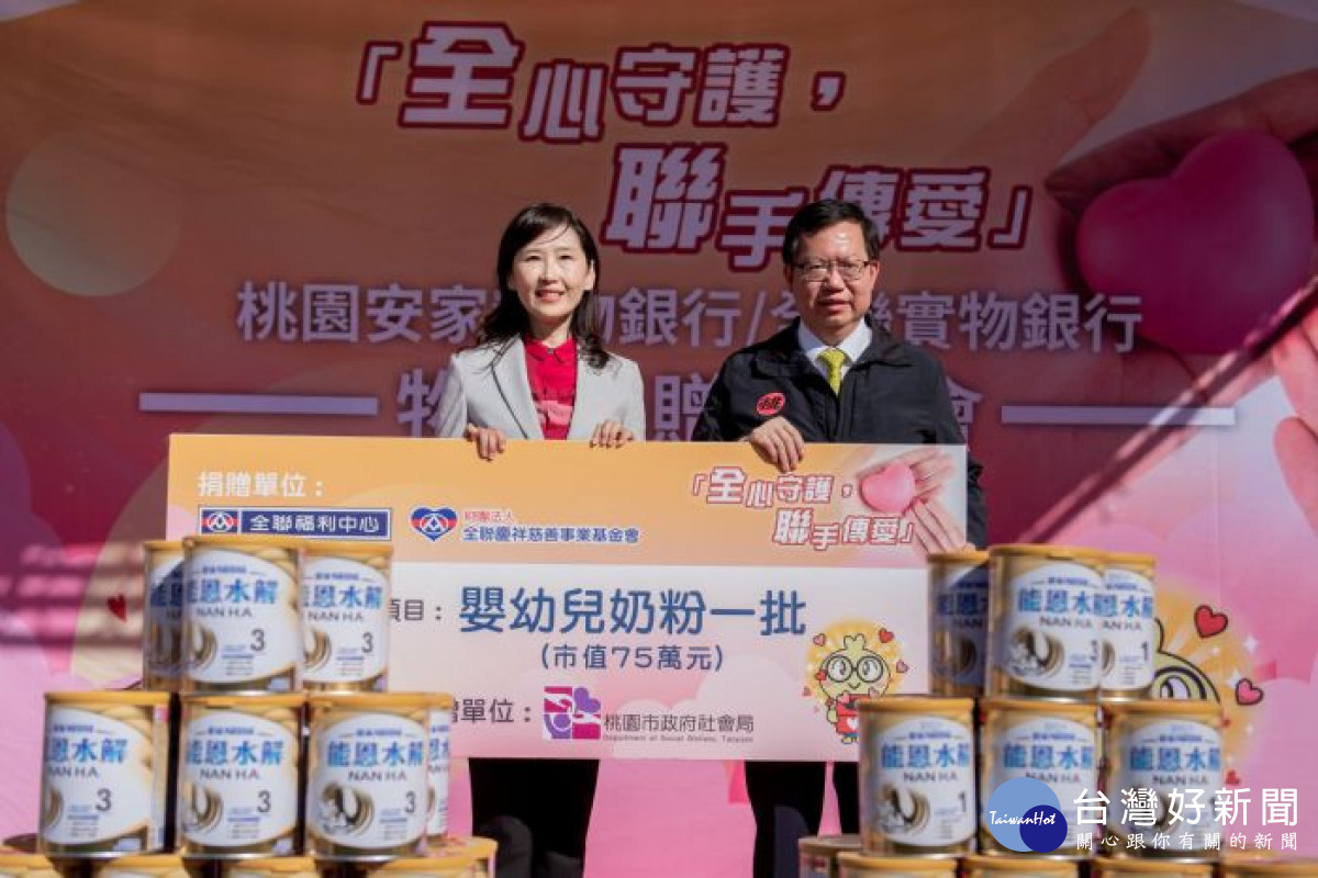 桃園市長鄭文燦8日前往桃園區,出席桃園安家實物銀行「全心守護,聯手傳愛」全聯慶祥慈善事業基金會捐贈活動。鄭市長表示,全聯是生活的好夥伴,也是社福的好夥伴,自106年迄今捐贈桃園安家實物銀行超過385萬元愛心物資,此次捐贈嬰幼兒奶粉、尿布、成人紙尿褲等市值約75萬元物資,也將納入桃園安家實物銀行,提供給桃園市弱勢家庭及社福團體運用,讓更多人獲得照顧、感受溫暖。