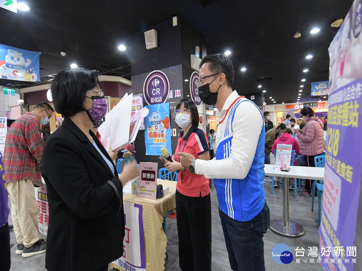 彰化縣府衛生局為提升COVID-19疫苗涵蓋率,繼上周在彰化及員林火車站設站後,於8日下午2時至4時30分,在全聯永靖新興店、北斗斗中店、員林店、社頭中山店、花壇學前店、彰化延平店等門市及家樂福彰化店,同步進行COVID-19莫德納疫苗接種服務,縣長王惠美分別前往永靖新興店及家樂福彰化店關心疫苗施打情形,對於可以就近前來施打,又有禮券及贈品可以拿,表示相當開心,王縣長也預告在12月12日本周日下午2時至4時30分,在彰化火車站前廣場,將再加開疫苗施打站,提供第1、2、3劑AZ、BNT、莫德納及高端四種疫苗,同時現場將有菲律賓、印尼、泰國及越南四國通譯人員,協助外籍朋友,鼓勵外籍移工、逾期停居留失聯移工及一般逾期停居留之外來人口,踴躍接種疫苗,確保社會防疫安全。