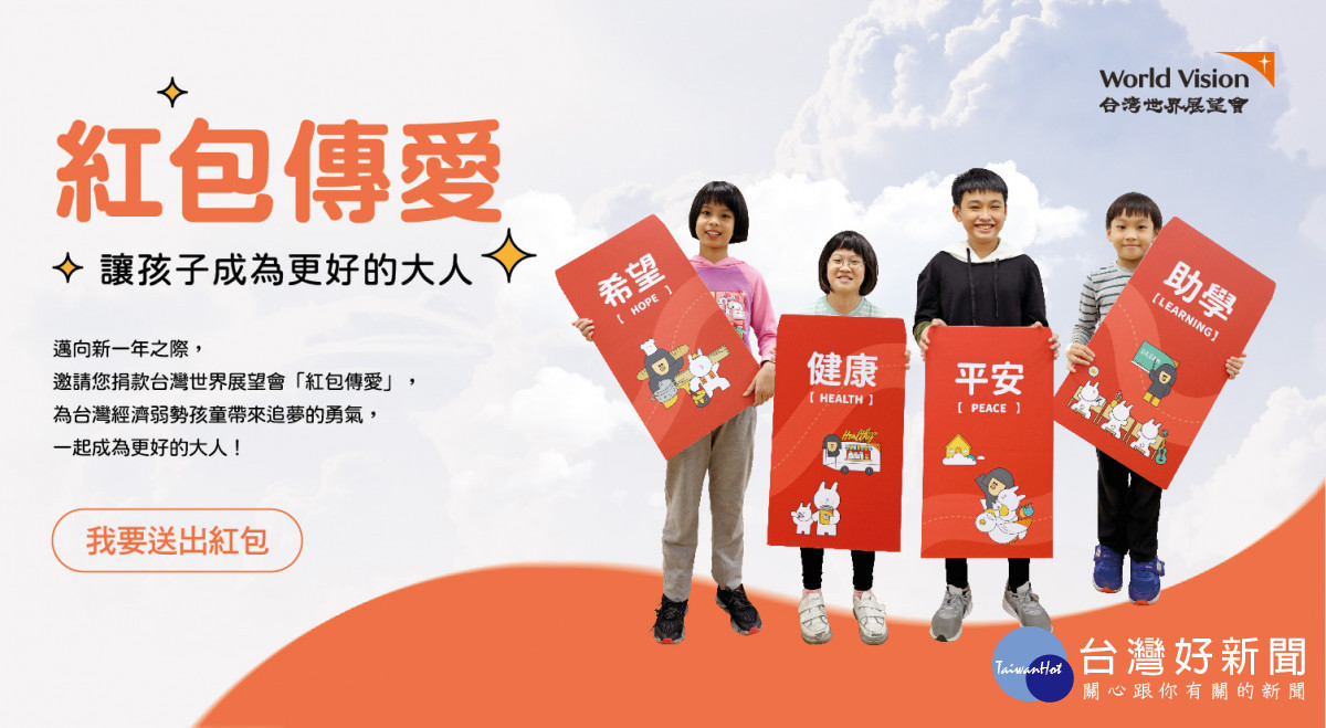 或利用郵政劃撥帳號:01022760,戶名:台灣世界展望會,請註明:助學紅包、健康紅包、平安紅包、希望紅包