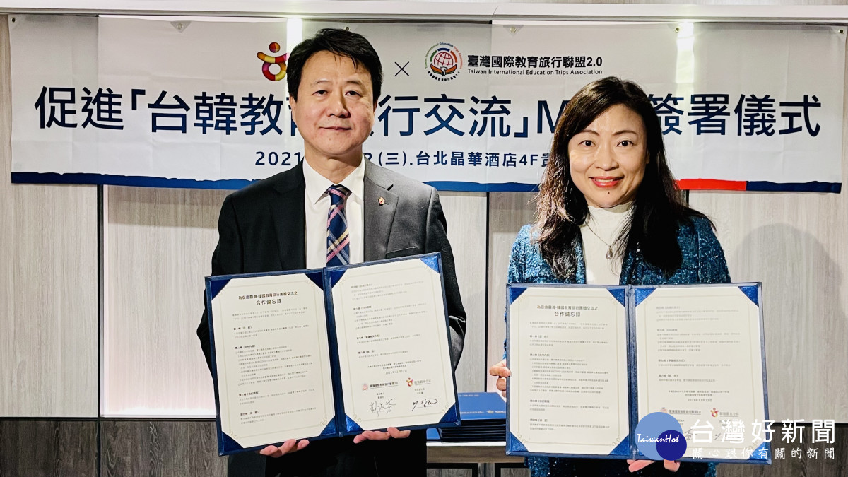 韓國韓國觀光公社與臺灣國際教育旅行聯盟2.0,簽訂合作備忘錄【台韓逗陣遊韓趣】計劃,由韓國韓國觀光公社台北支社李長儀支社長,與臺灣國際教育旅行聯盟2.0總召集人劉淑芬校長代表簽署。