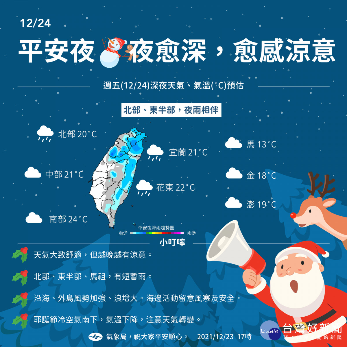 週五的平安夜,氣溫舒適, 北、東部,請帶雨具。注意!耶誕節 (12/25)冷空氣南下,天氣轉冷。