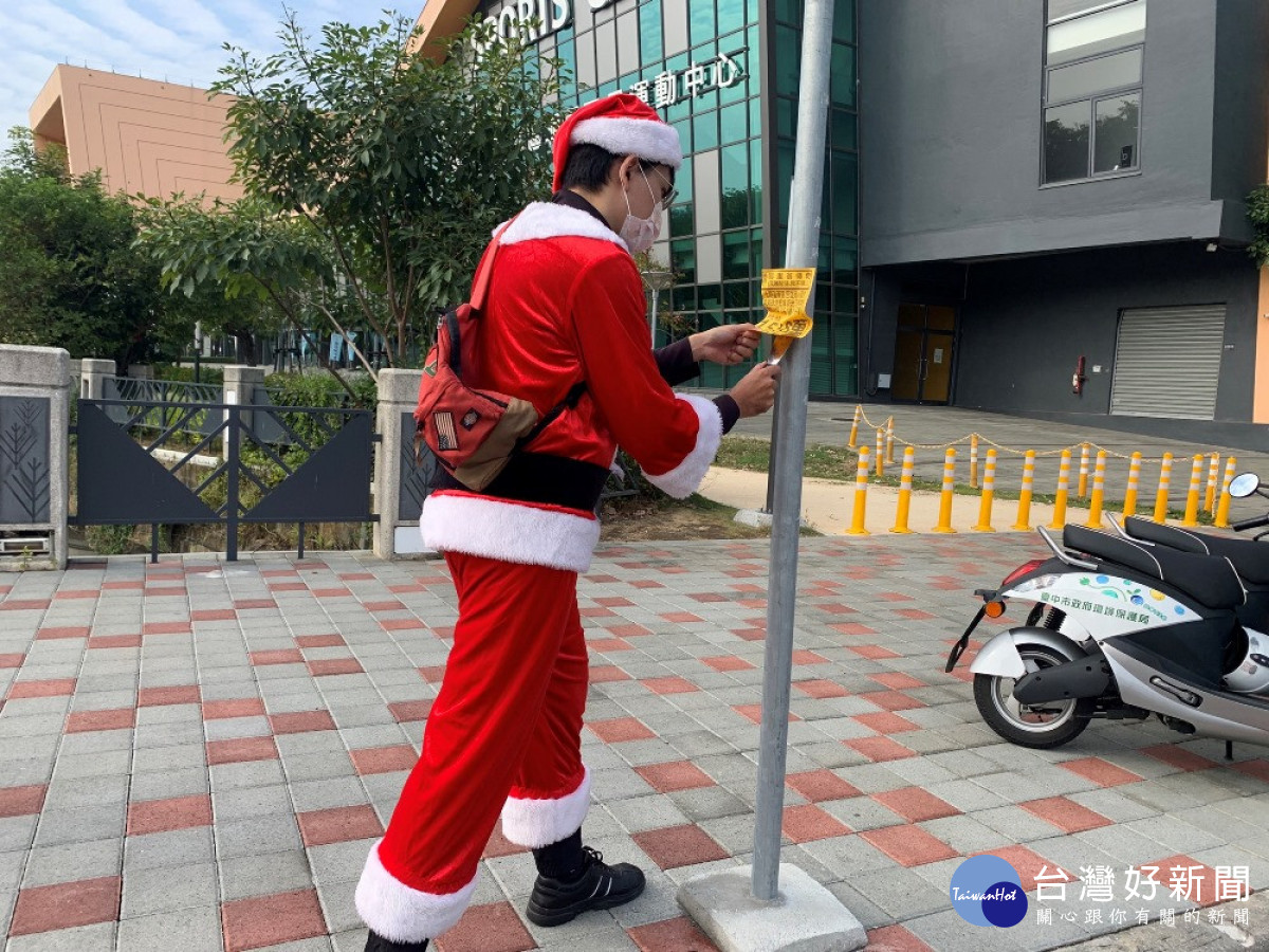 另外西屯區清潔隊長陳益興說,西屯轄內有市府廣場、新光三越與台中大遠百、秋紅谷及國家歌劇院等著名地標,也都紛紛出現應景裝置及閃亮燈飾,為讓遊客到訪有良好印象,清潔隊努力執行市容維護,同仁也會騎電動機車上路,以環保的方式執行環保工作,做好公部門帶頭節能減碳的模範,因此為響應耶誕嘉年華,同仁化身聖誕老公公與麋鹿騎著電動機車出勤,剛上路時還有點彆扭害羞,不過工作魂一上身,開始認真拆除違規廣告後也就忘記尷尬了,反而讓民眾感覺到很有新鮮感,還吸引民眾要求一起拍照打卡。