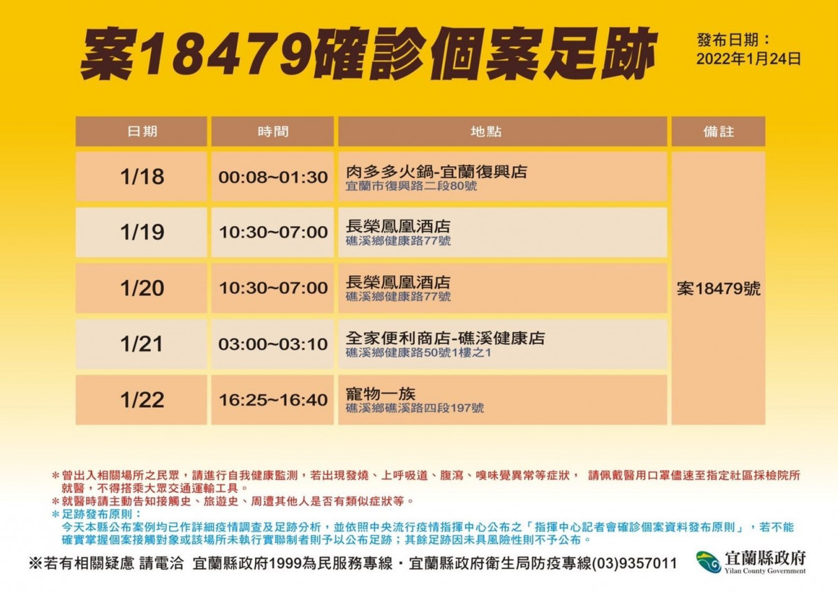針對案18443確診個案,宜蘭縣府昨(23)日迅速在個案工作的地點設立篩檢站做篩檢,總計完成篩檢915人,其中包括旅客544人,員工371人,有2名員工PCR檢測結果確定為陽性。因此,今(24)日共新增4名確診個案。