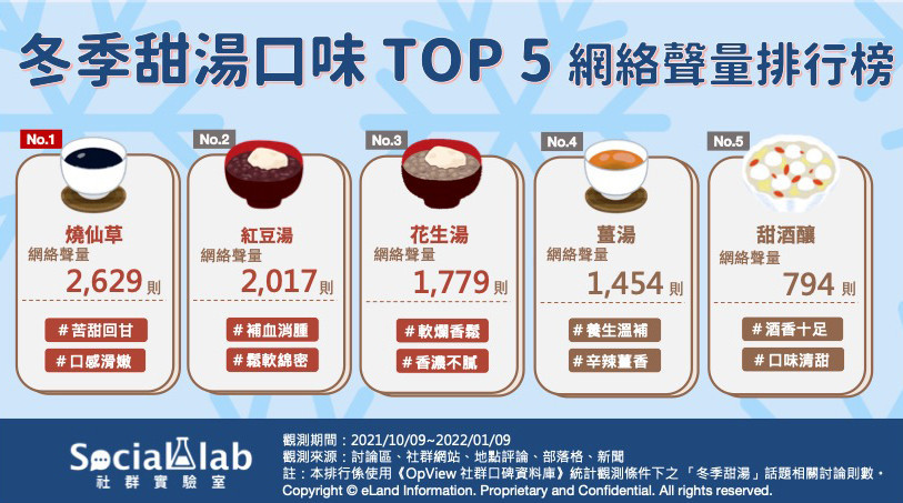 《Social Lab社群實驗室》本次透過《OpView社群口碑資料庫》追蹤最近三個月內「冬季甜湯」話題的網路聲量表現,帶您了解有關於冬季甜湯的網路聲量討論,以及網友對甜湯配料的看法。