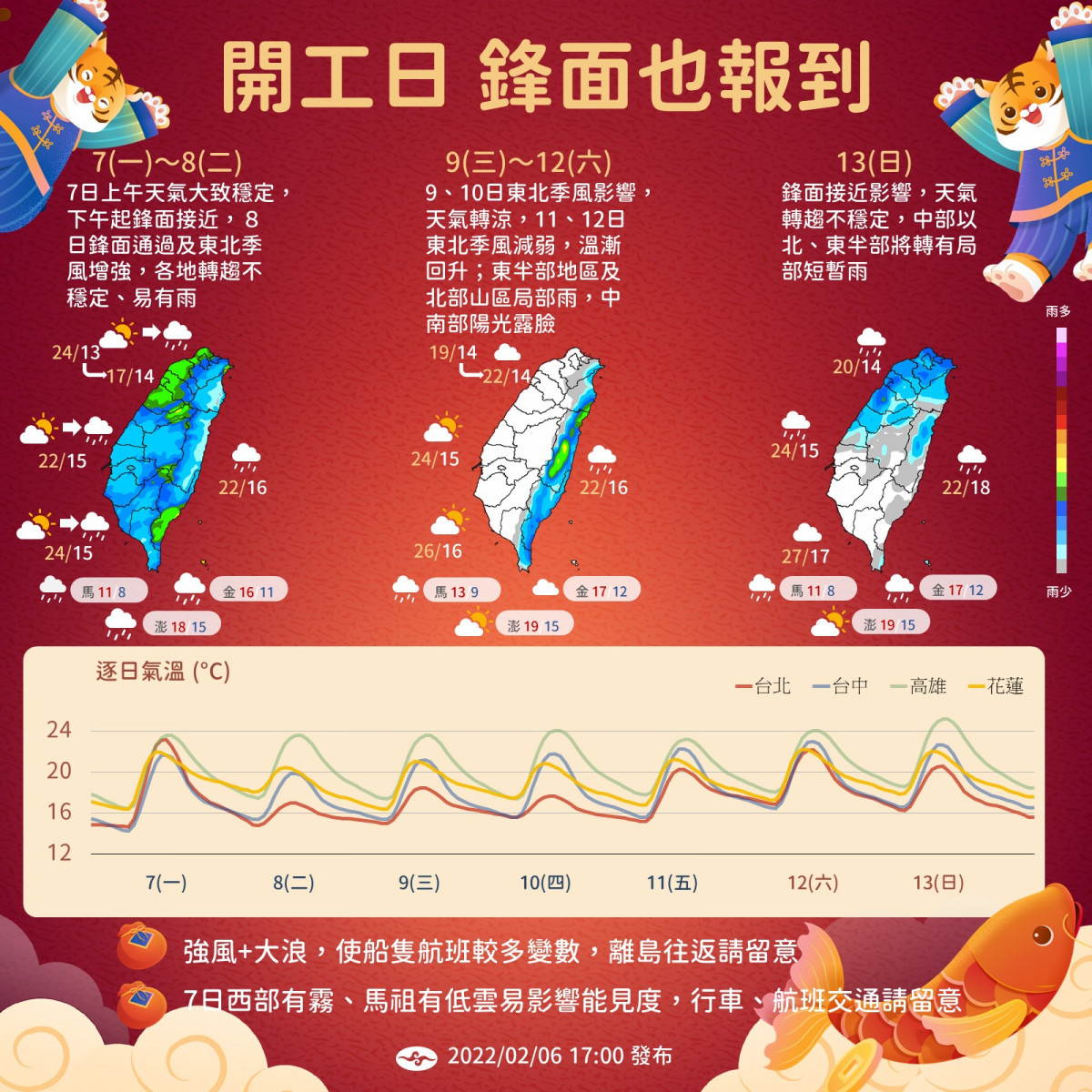 【週二】(2/8),鋒面通過及東北季風增強,天氣不穩定,各地有短暫陣雨,明顯降雨主要在上半天之前,下半天降雨較趨緩,北部、東北部氣溫稍下降。週一晚起至週二風強浪大,離島交通請多注意船班資訊,週二之前,鋒面通過水氣多,如果溫度搭配得宜,3500公尺以上高山有機會降雪,登山活動務必注意安全。
