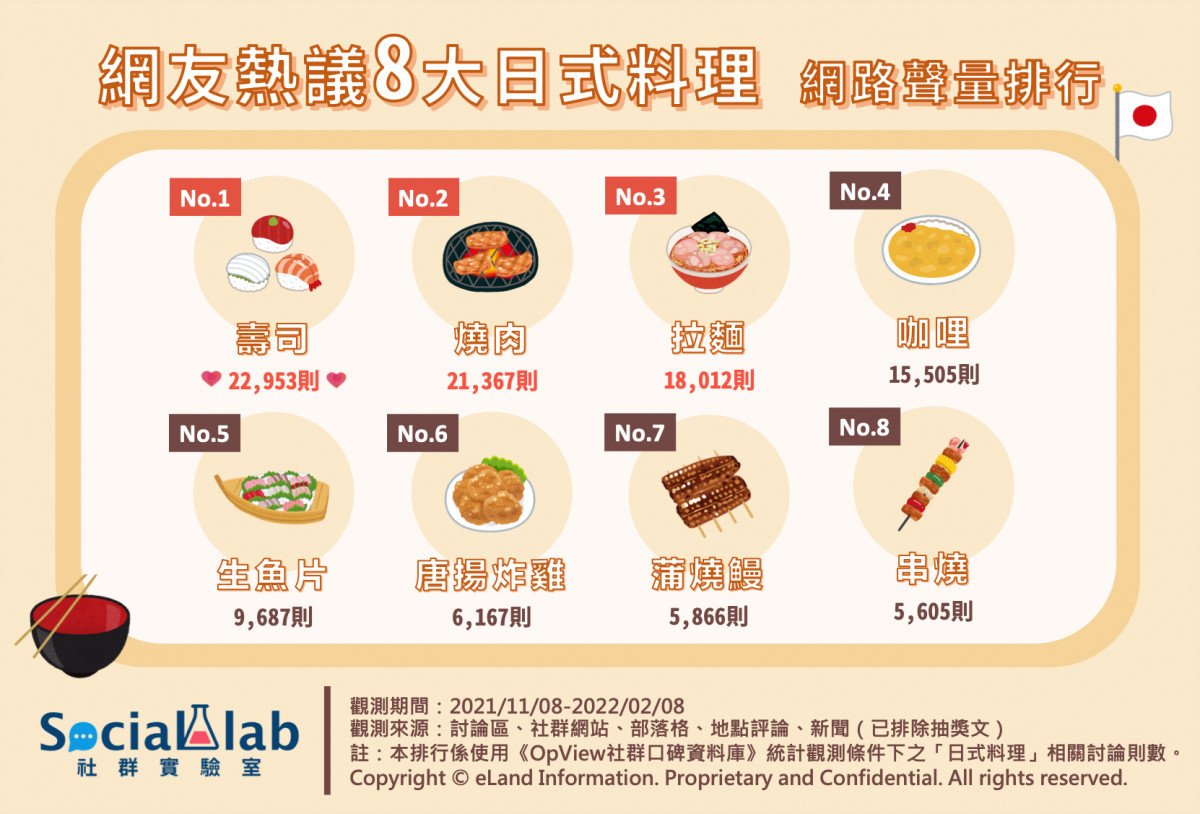 《Social Lab社群實驗室》本次透過《OpView社群口碑資料庫》追蹤近三個月來「日式料理」與「日式甜點」等話題的網路聲量表現,帶您了解網友熱議的八大日式料理,以及五大日式甜點的路聲量排行。