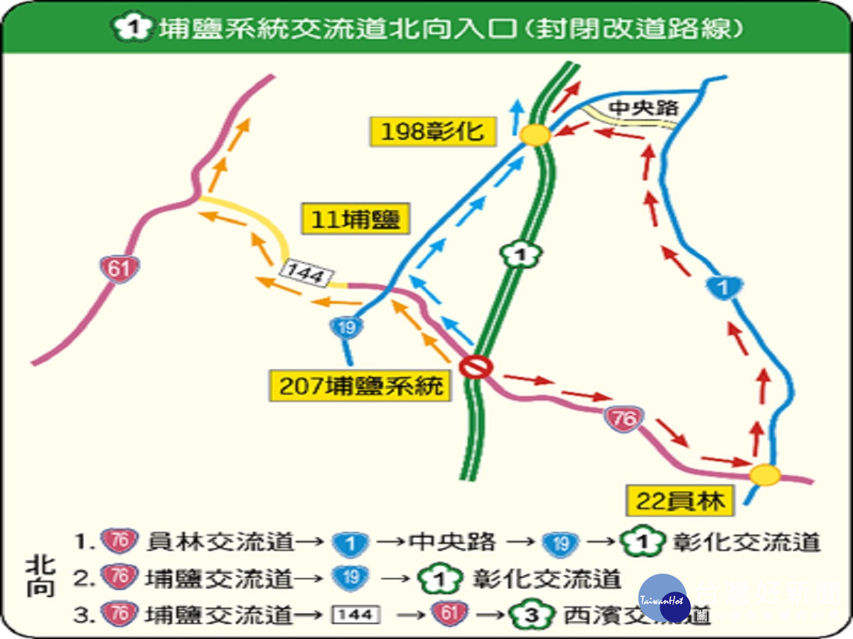 替代道路規劃如下:(一)台76線欲轉國道1號南下,可由台76線埔心交流道→埔心聯絡道→右轉縣148線(員鹿路)→國道1號員林交流道,或由台76線埔鹽交流道→台19線(彰水路、東環路)→左轉縣148線(員鹿路)→國道1號員林交流道。(二)台76線欲轉國道1號北上,可由台76線埔鹽交流道→台19線(彰水路)→國道1號彰化交流道,或左轉縣144線(員大排道路)→台61線。
