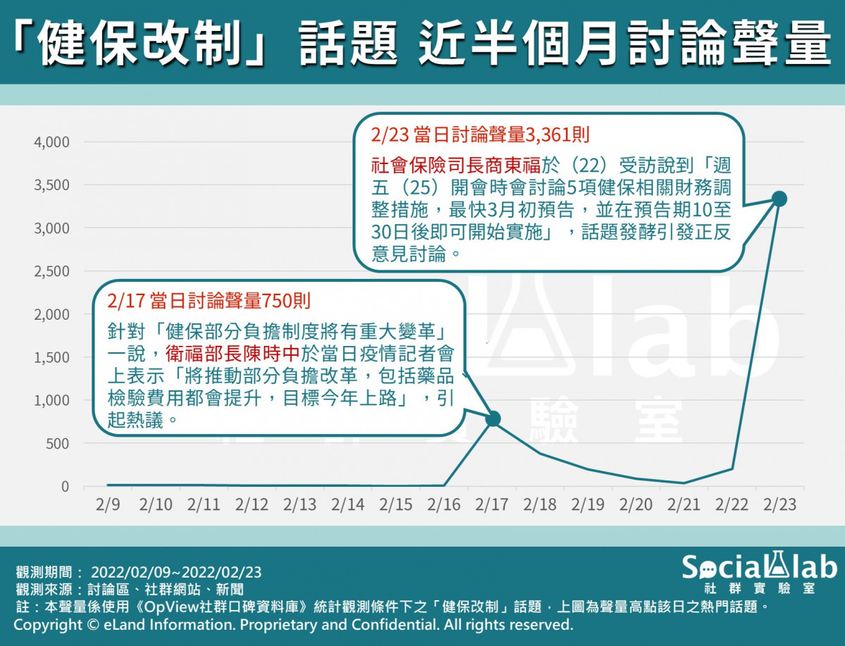 首先看到在2月17日,衛福部長陳時中於每日疫情記者會上表示,有關於健保部分負擔費用會調整的說法屬實,將會積極推動改革,改革方向包含藥品、檢驗費用的提升,引起網友們反彈,如「怎麼一直增加一些必要費用,快吃不消了」、「去年漲、今年又漲」等;不過也有人表示贊同,認為「對一般民眾較無感」、「希望可以藉此遏止濫用醫療資源的人」,另外也有民眾提到「有慢性疾病的患者,負擔可能會加重」,提到政府應謹慎考量規劃,引發各式的討論。