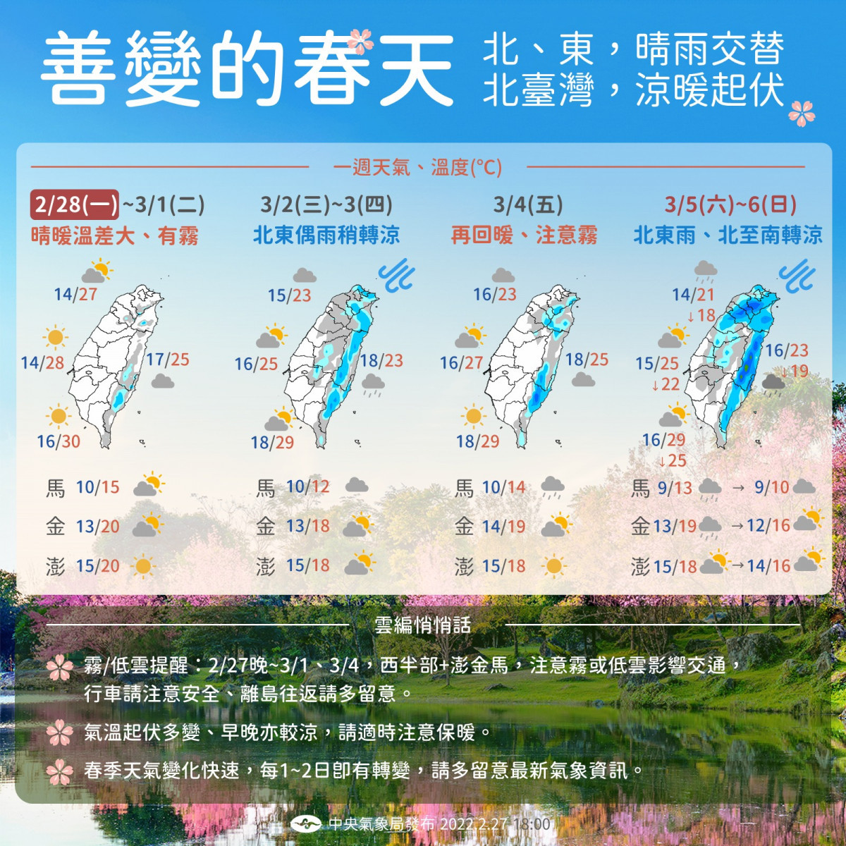 2/28(一)~3/1(二) 舒適、溫差大、易有霧,西半部、澎金馬,留意霧/低雲影響交通。