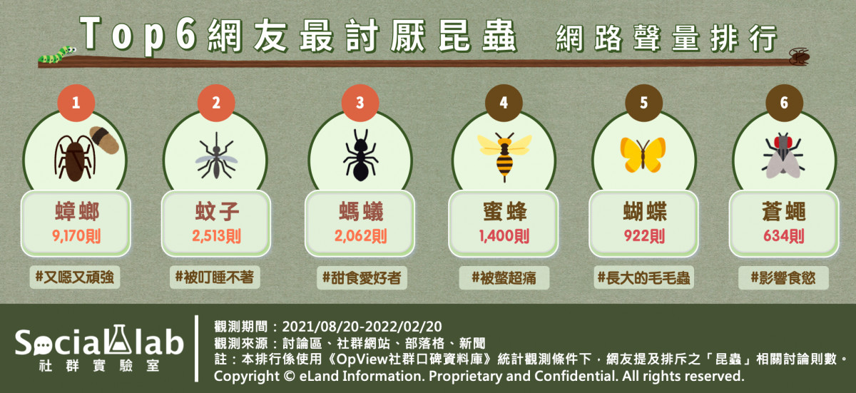 《Social Lab社群實驗室》本次透過《OpView社群口碑資料庫》追蹤近半年內網友提及排斥之「昆蟲」話題,調查網友討厭的昆蟲有哪些。