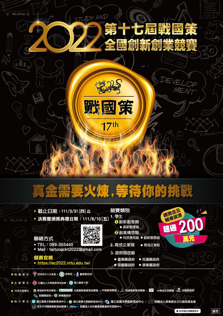 宜蘭縣政府重視青年發展,為實踐支持創新創業及培養創業家之目的,今(111)年首度與中華創業育成協會及國立臺東大學共同主辦「第17屆戰國策全國創新創業競賽」,並設置「東部地方特色產業組」,總獎金高達15萬元,即日起受理報名至3月31日(週四)止,竭誠歡迎18至45歲青年們踴躍組隊參加。