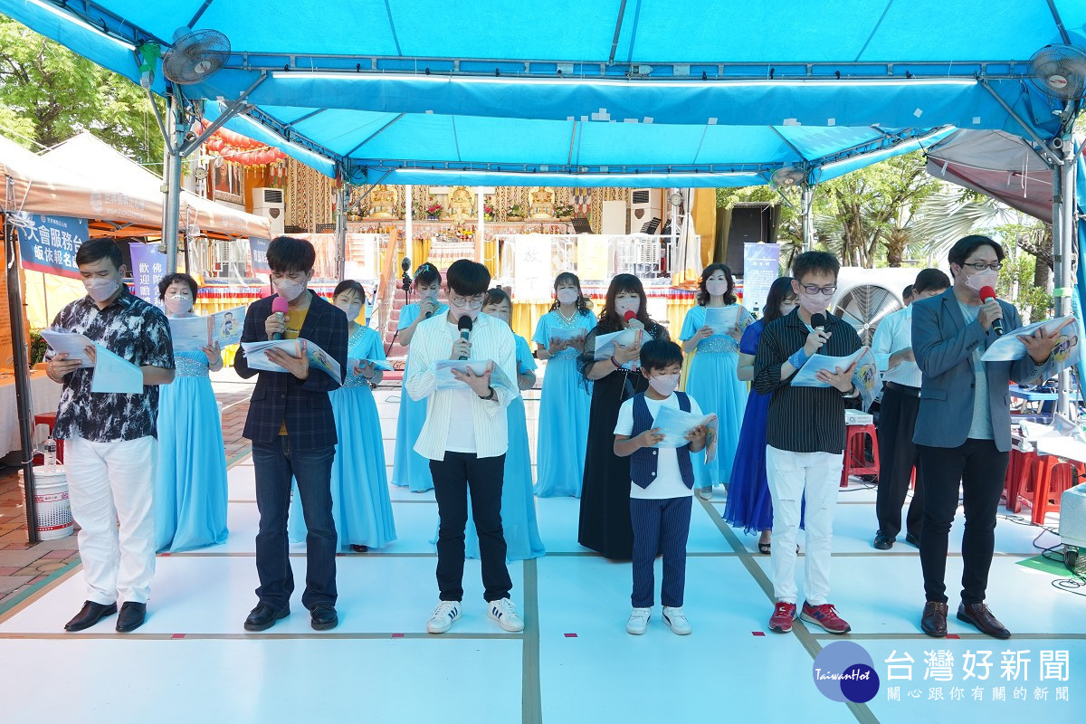 祈福法會週六一早,由采荷土風舞社、JOY二重唱及潮州歡樂薩音樂團隊以精湛的音樂演出拉開法會序幕,特別的是有位來自屏東76歲氣切多年的潘女士,帶著氧氣瓶坐著輪椅,以不可能發聲的狀況帶來兩首歌曲樂藝供佛。