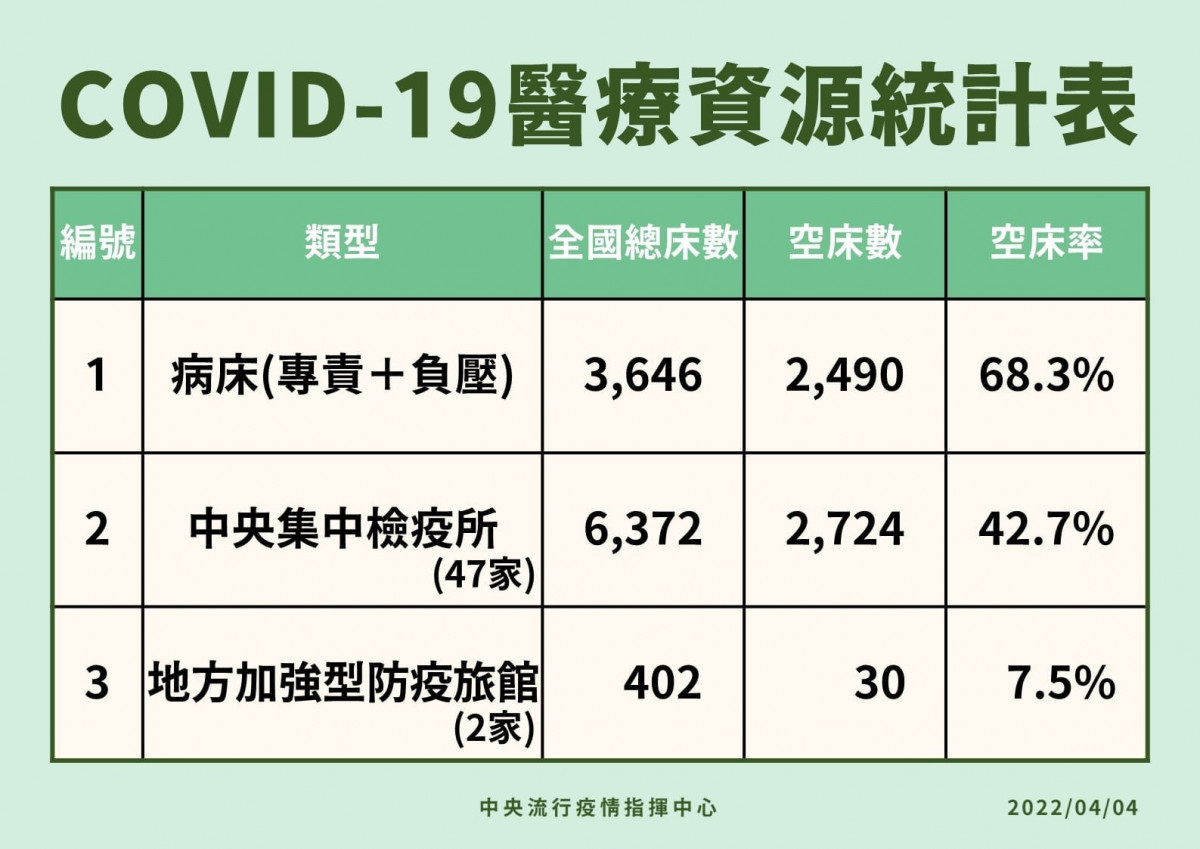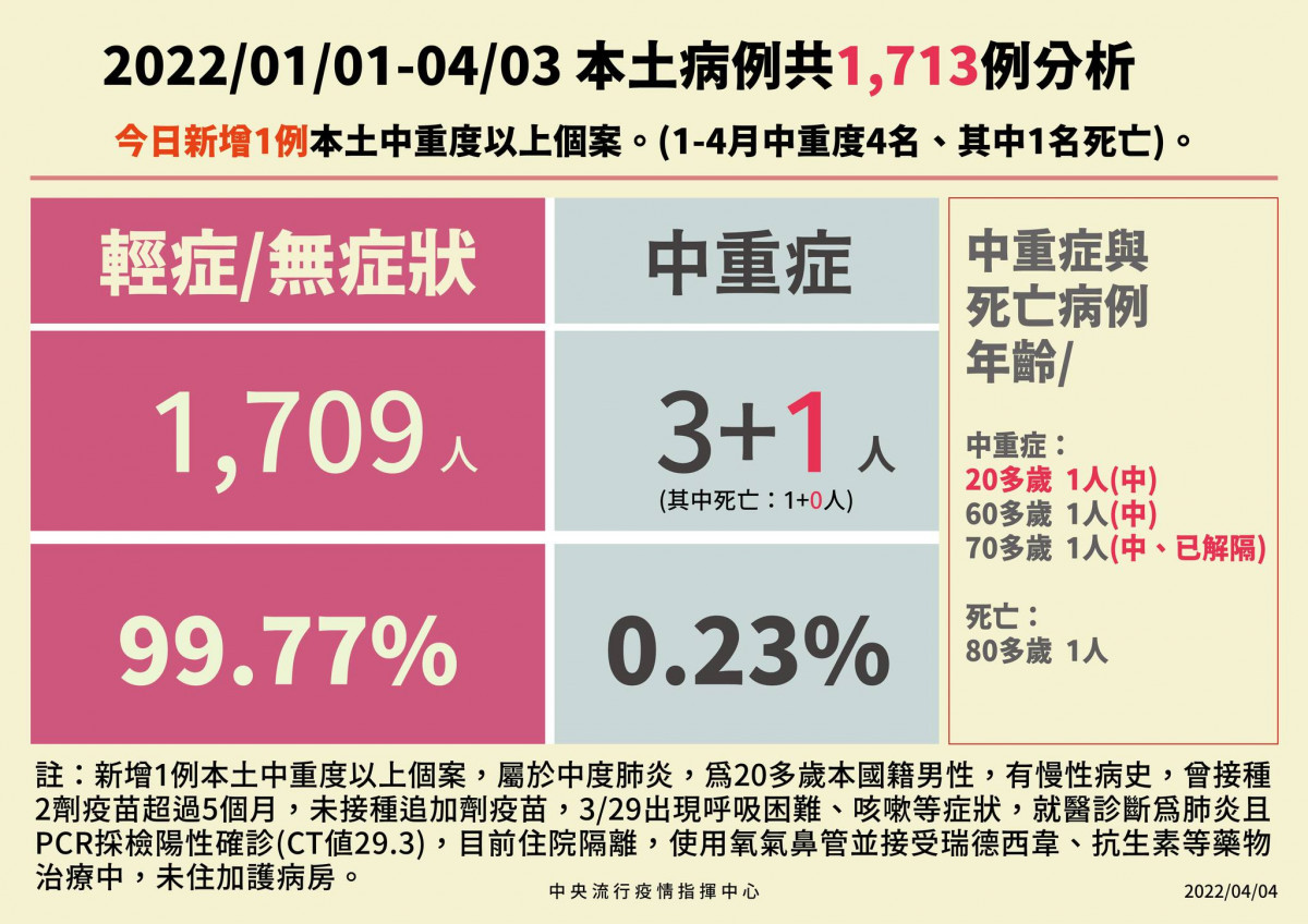 指揮中心指出,今日新增之133例本土病例,為64例男性、69例女性,年齡介於未滿5歲至90多歲,發病日介於今(2022)年3月27日至4月4日,其中包含50例為無症狀感染。個案分佈為新北市(46例)、基隆市(31例)、台北市(23例)、桃園市(15例)、宜蘭縣(6例)、新竹縣(4例)、花蓮縣(3例)、新竹市(2例)、台中市、高雄市及屏東縣(各1例)。