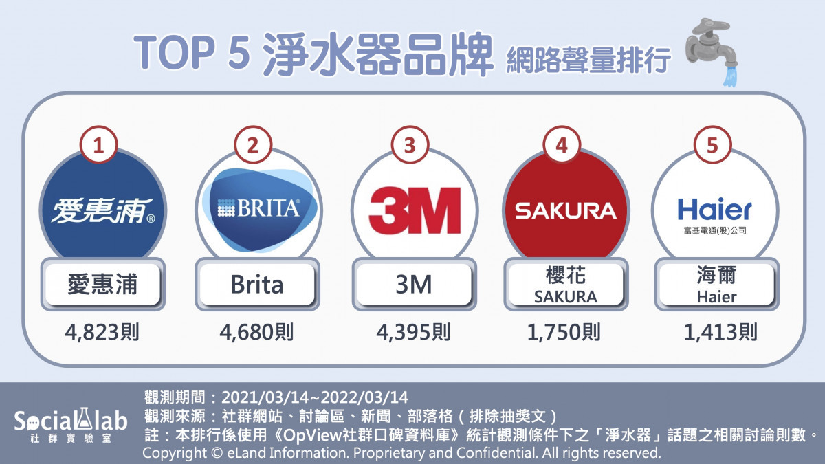 《Social Lab社群實驗室》本次透過《OpView社群口碑資料庫》追蹤最近一年內「淨水器」話題的網路聲量表現,帶您了解網友熱議的五大淨水器品牌網路聲量排行,以及淨水器的五大選購考量。