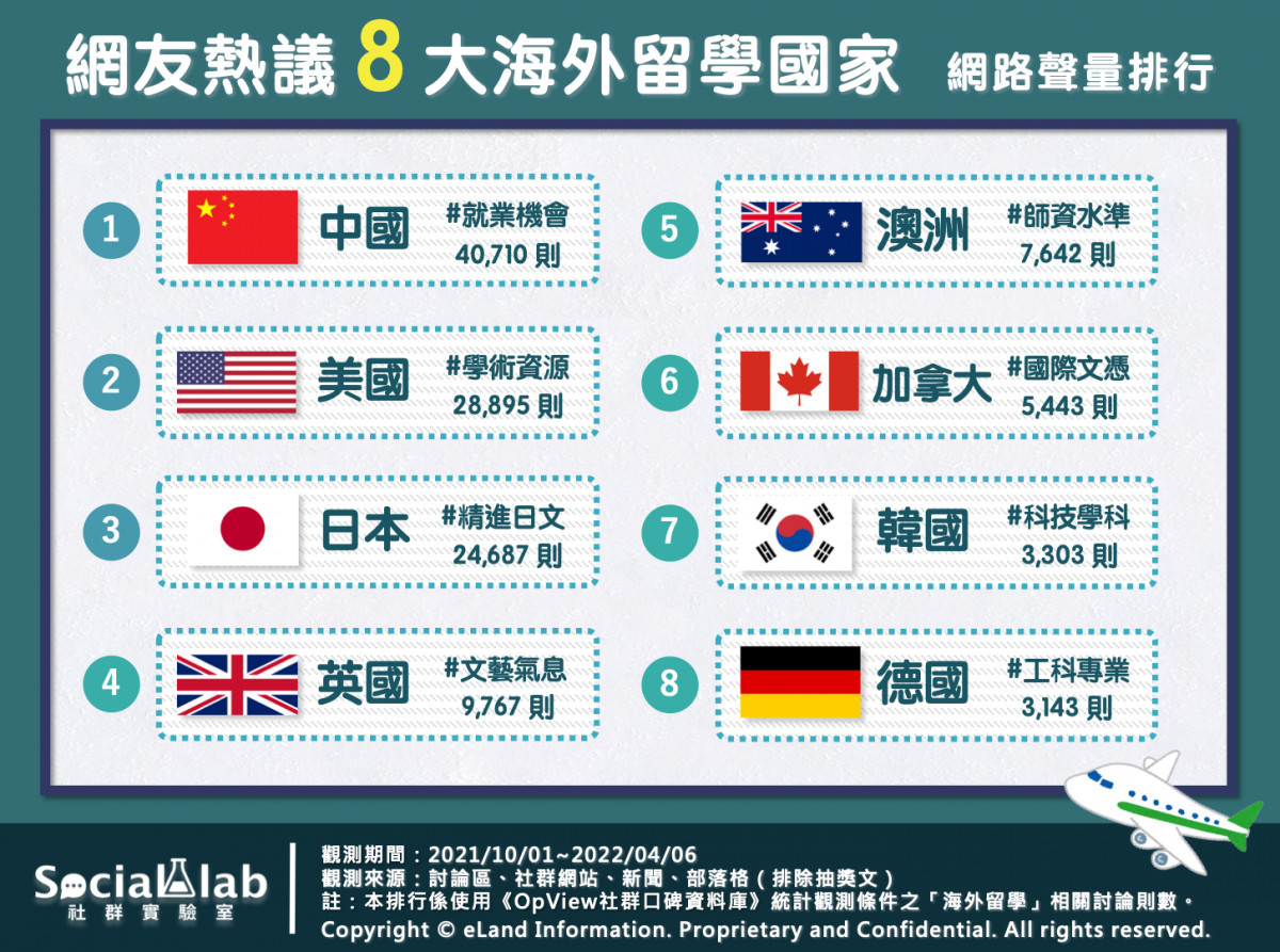 《Social Lab社群實驗室》本次透過《OpView社群口碑資料庫》追蹤近半年內「海外留學」話題的網路聲量表現,帶您了解網友熱議的八大留學地點以及四大出國留學理由。