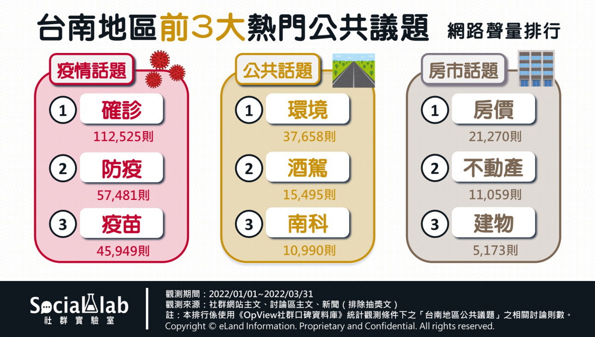 觀察網友對於台南地區的公共議題討論,持續延燒的「疫情」成為焦點,每日持續公布的地區「確診」數量受到矚目,但也有網友建議「數字已不是重點,應該提早規劃共存對策」;此外在3月初時,台南市長黃偉哲曾宣布口罩禁令不鬆綁,嚴格「防疫」,也因與當初中央規劃的防疫方向不同,而受到大量民眾的關注與討論。