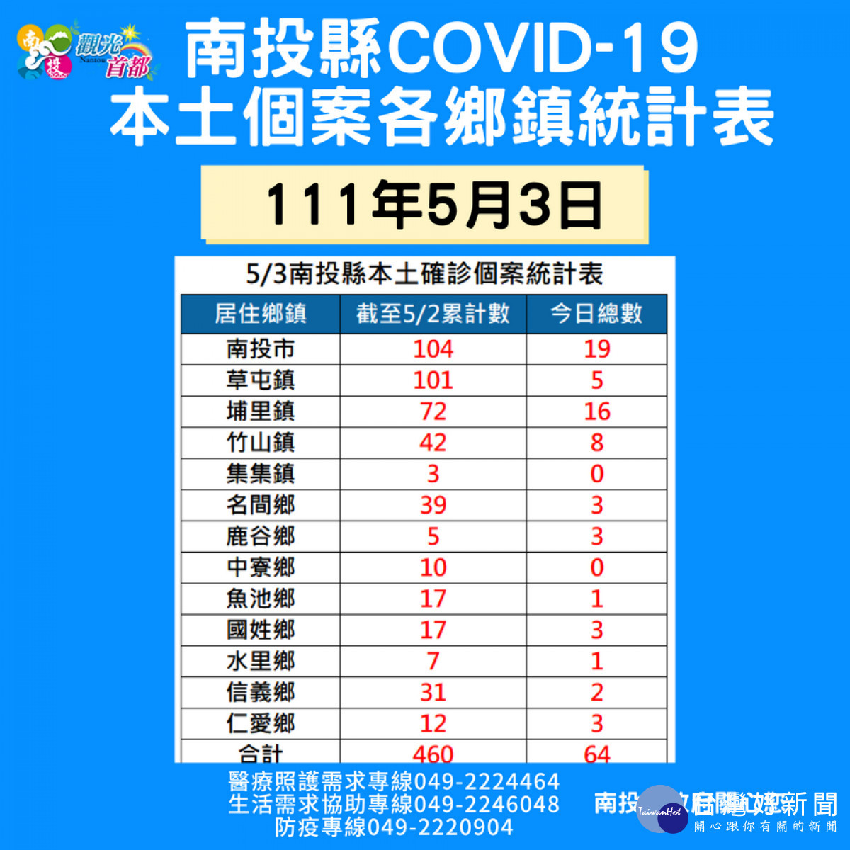 南投縣染疫數據不斷增加,至2日止已達460例,依據感染來源分類其他感染未明34例、家庭感染13例、職場感染8例、校園感染6例、朋友感染3例。目前居家隔離人數298例,居家照護人數256例,今日已解除隔離人數258例。