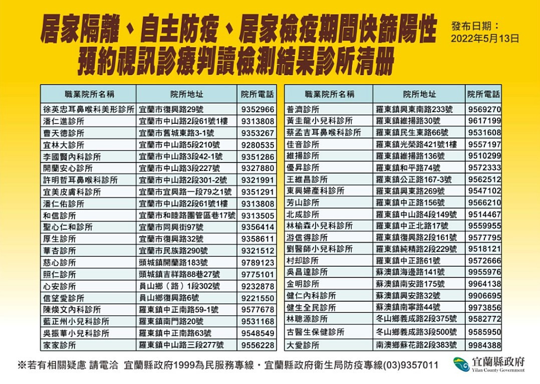 中央13日宣布宜蘭縣新增1,425名確診個案。宜蘭縣長林姿妙表示,為了提供快速安全的就醫環境,將依照感染風險分流需要看診的民眾,即日起推出「居家快篩陽性視訊診療判讀」服務;另外,還有「防疫診」、「就醫綠色通道」等醫療服務,請有需求的民眾依據自身狀況前往就診,不僅能縮短等待看診的時間,也保護宜蘭人的集體健康。