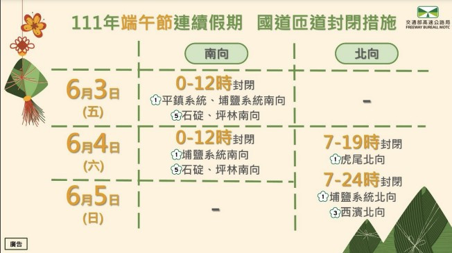 111年端午節連假將屆,高速公路局參考歷年端午節連假交通量及交通特性,規劃實施高乘載管制、匝道封閉、匝道儀控等多項管制措施,請民眾多加注意。另外,高公局亦提供連假期間國道較好走時段,建請需自行開車行駛國道之民眾多加利用,以避免壅塞。