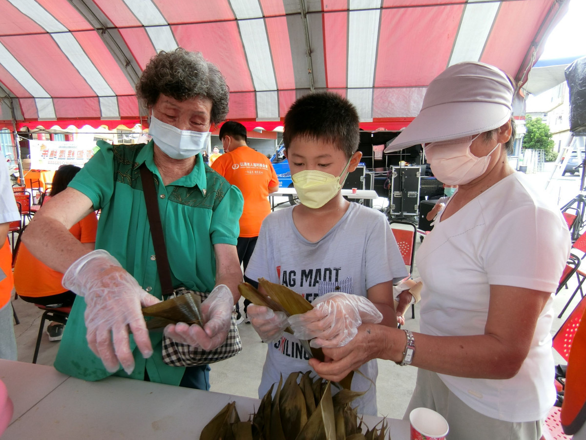 東石鄉龍舟賽是嘉義縣大型端午活動,因為疫情關係,今年已經連續第三年停辦,而港墘社區往常也會在端午節時,讓社區民眾一起包粽子,為了延續傳統過節氣氛及習俗,弘道嘉義服務處今年特別舉辦戶外端午節活動,現場將民眾分成六組,每組都有一位在地長者當小老師,教其他人如何包粽子,許多第一次嘗試的人,米料及餡料總拿捏不準,有的則是將粽子包成奇形怪狀,引起陣陣的歡笑聲,而老一輩的人,過往端午節都會包粽子分送給鄰居,是包粽子的好手,但因年紀大加上人口減少,以往的歡樂氣氛漸漸不在,這次活動不但讓長輩重拾過往包粽技藝,還能把這項傳統習俗傳承下去,而包好粽子在等待煮熟的過程中,民眾則開始玩起趣味小活動,如:用粽子造型的球丟九宮格,有如粽子投江,還有用腳將長地毯捲起收好,就像在海浪上踏行,在遊戲設計上,兼顧了手部、腳部的練習及趣味性,讓社區居民與據點長輩一起同樂。